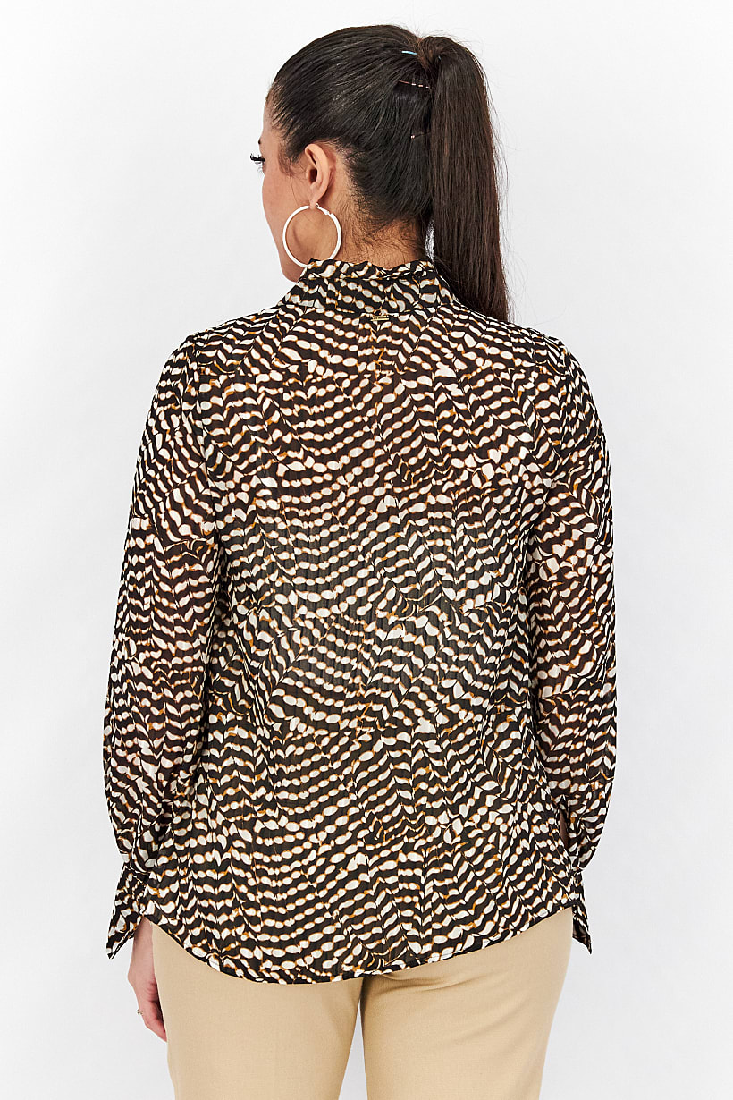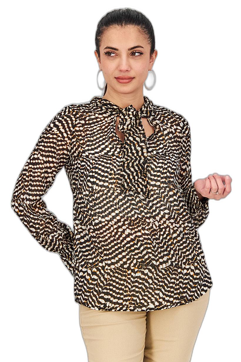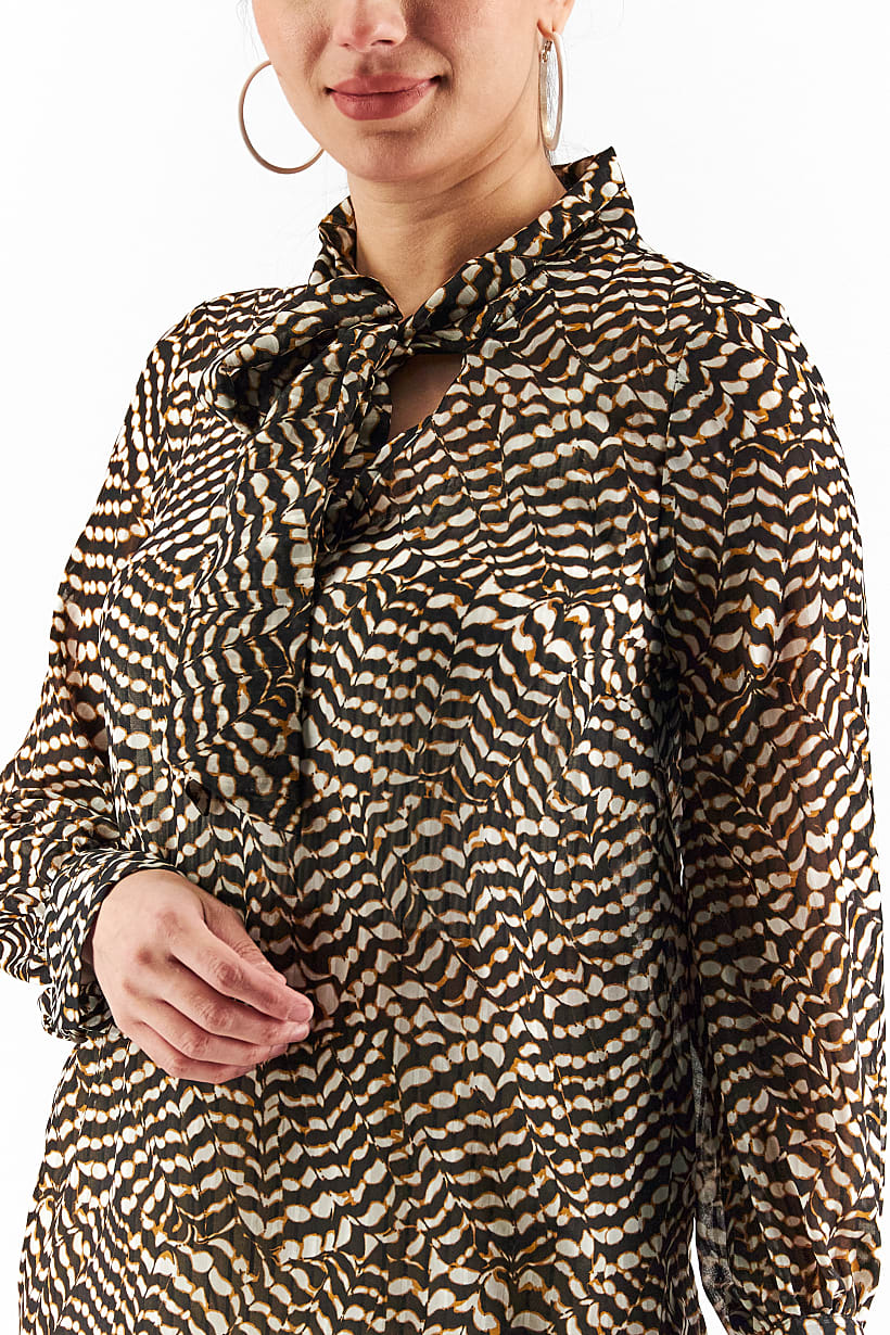 | sub_Categories | Women Clothing, Tops & Tees, women tie neck long sleeve allover print blouse black white |