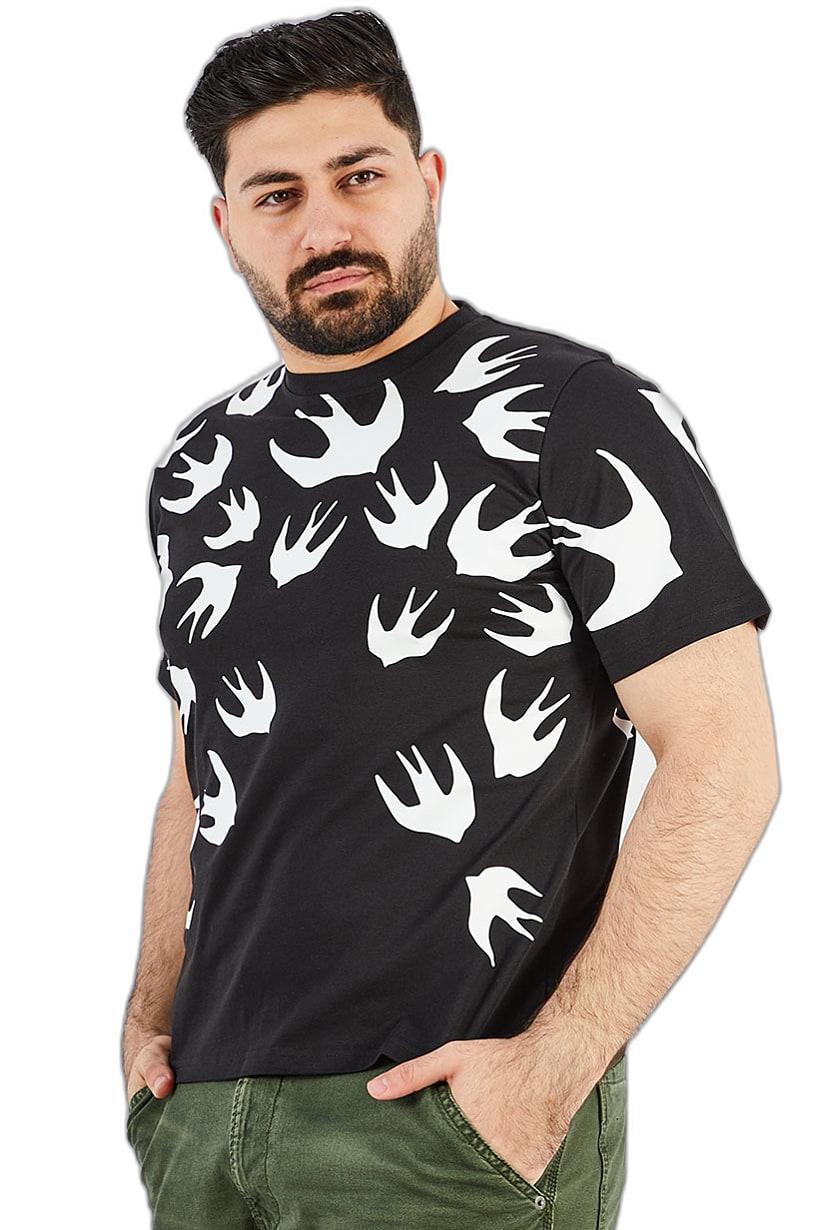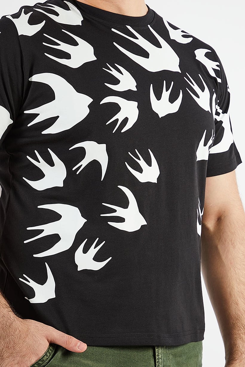 Black and white printed men’s crew neck t-shirt with short sleeves.