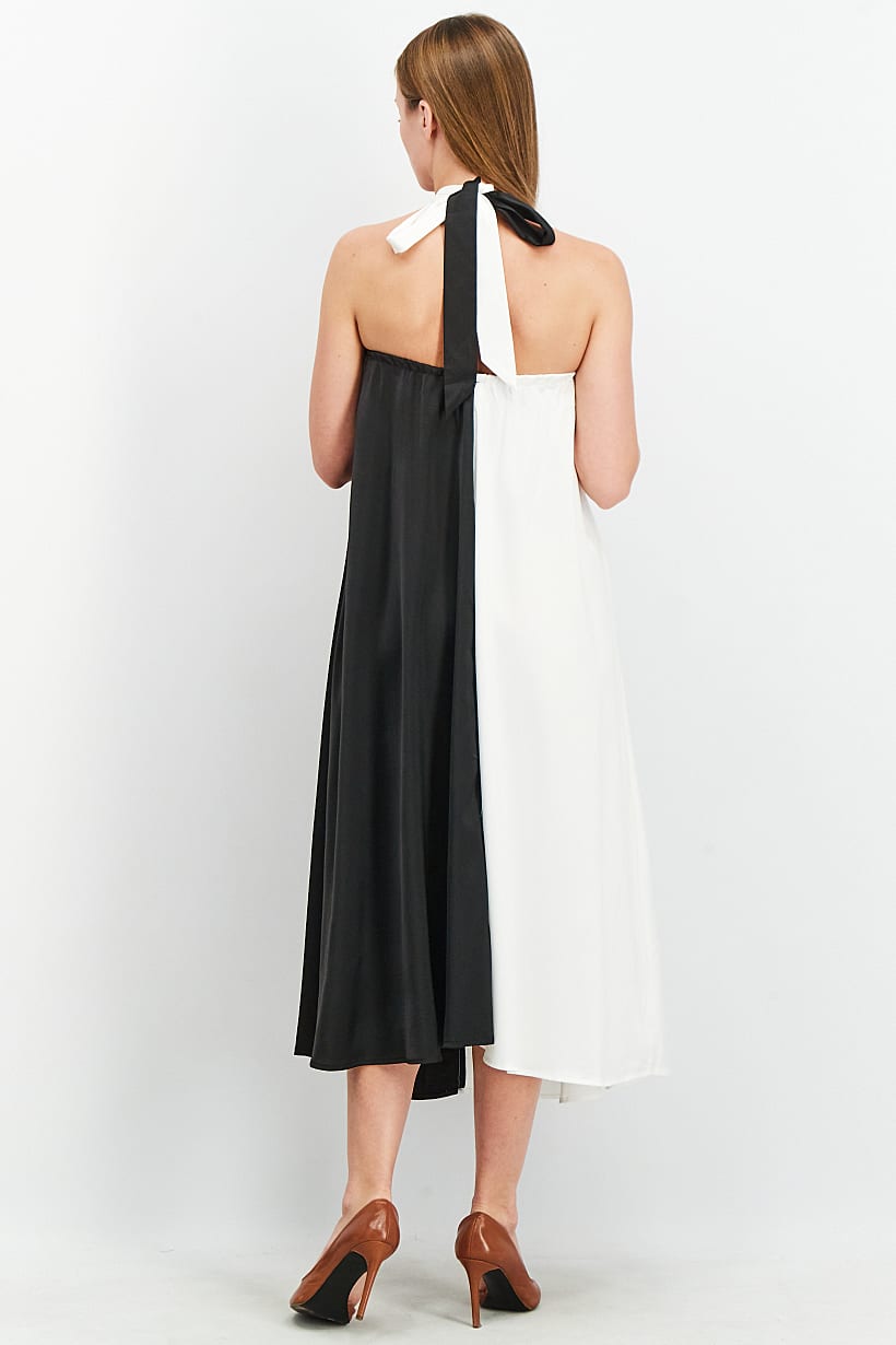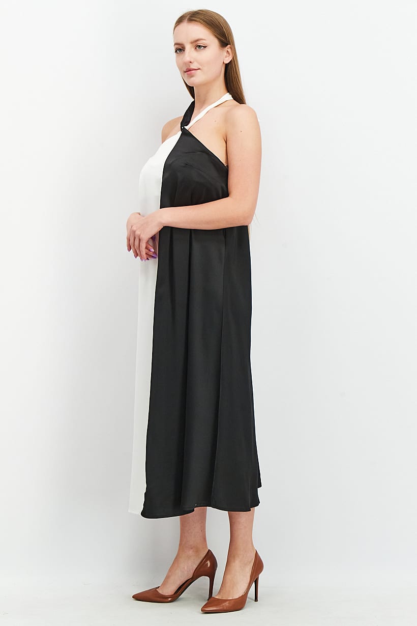 This product is easy to care for as it is machine washable. It is a mini dress with a regular fit and is shown in EU size. The hem is straight and the neckline and collar are halter style. The dress has strapless sleeves and features a colorblock pattern. It is suitable for casual occasions and has a pullover and tie closure. Please note that the product color may appear slightly different due to lighting or monitor settings. The dress is made of 95% polyester and 5% elastane and comes in the color black.