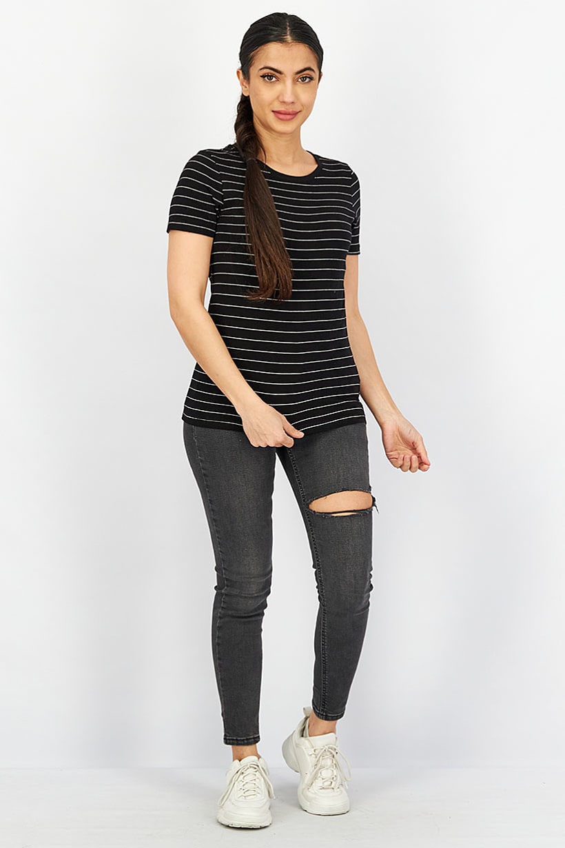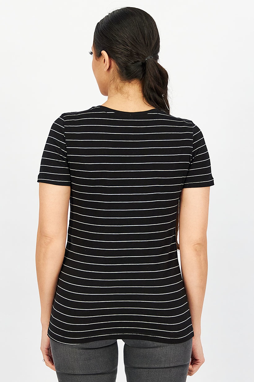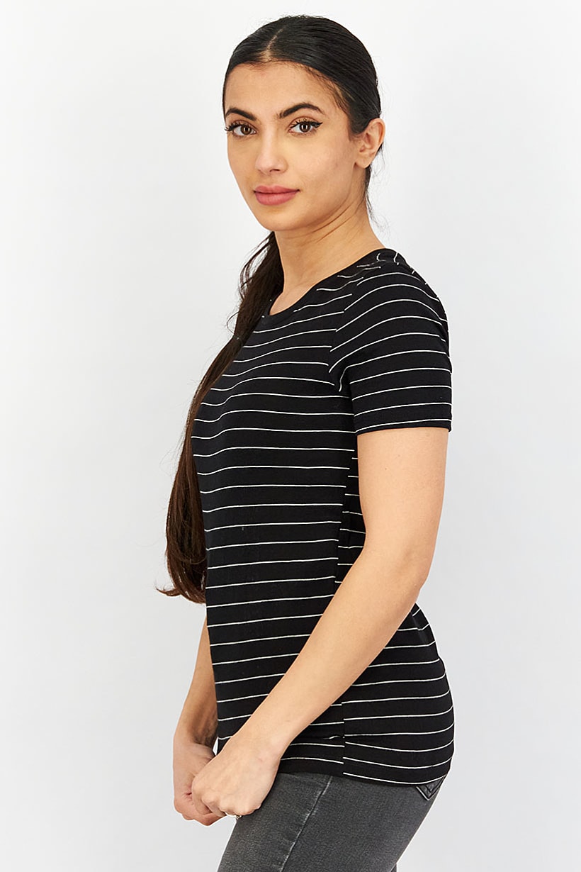 | descriptionOriginal | Care : Machine washable, Fit : Regular fit, Ideal For : Women, Size shown : International, Top Style : T-Shirt, Types of Hem : Straight hem, Types of Neckline & Collar : Crew neckline, Types of Sleeve : Short sleeve, Disclaimer : Product color may slightly vary due to photographic lighting sources or your monitor settings., Fabrics : 100% Cotton, Occasion : Casual, Pattern & Print : Stripe, Types of Closures : Pullover, Color Family : Black, |
