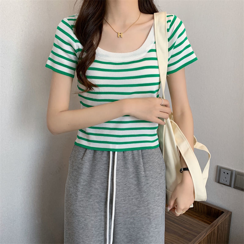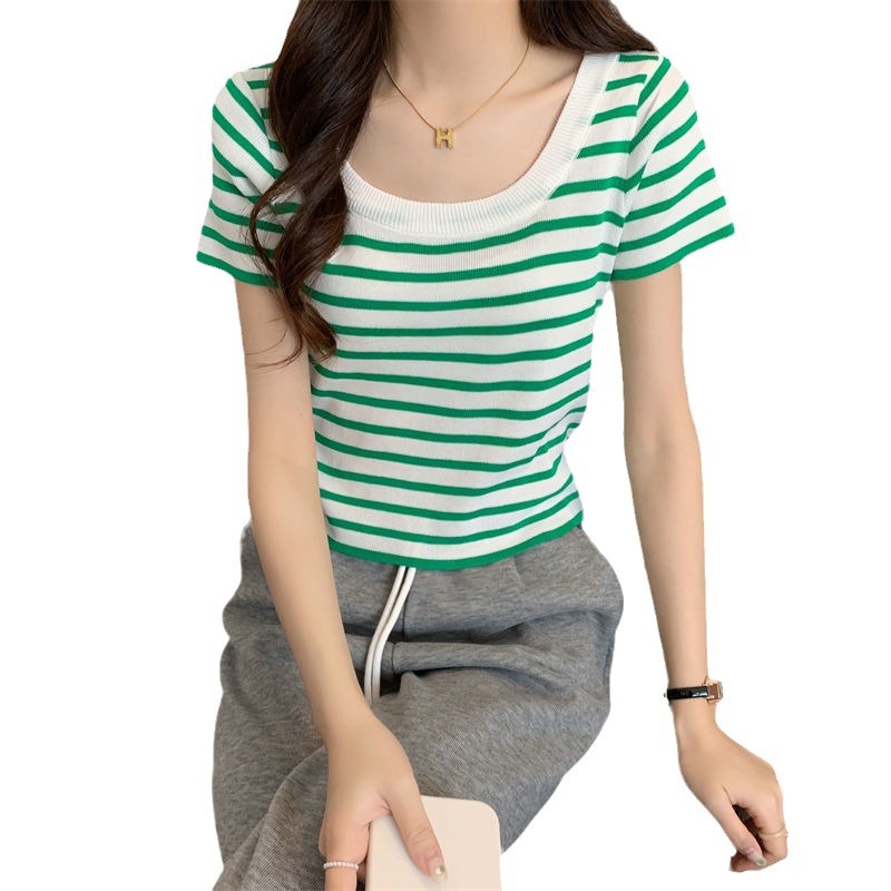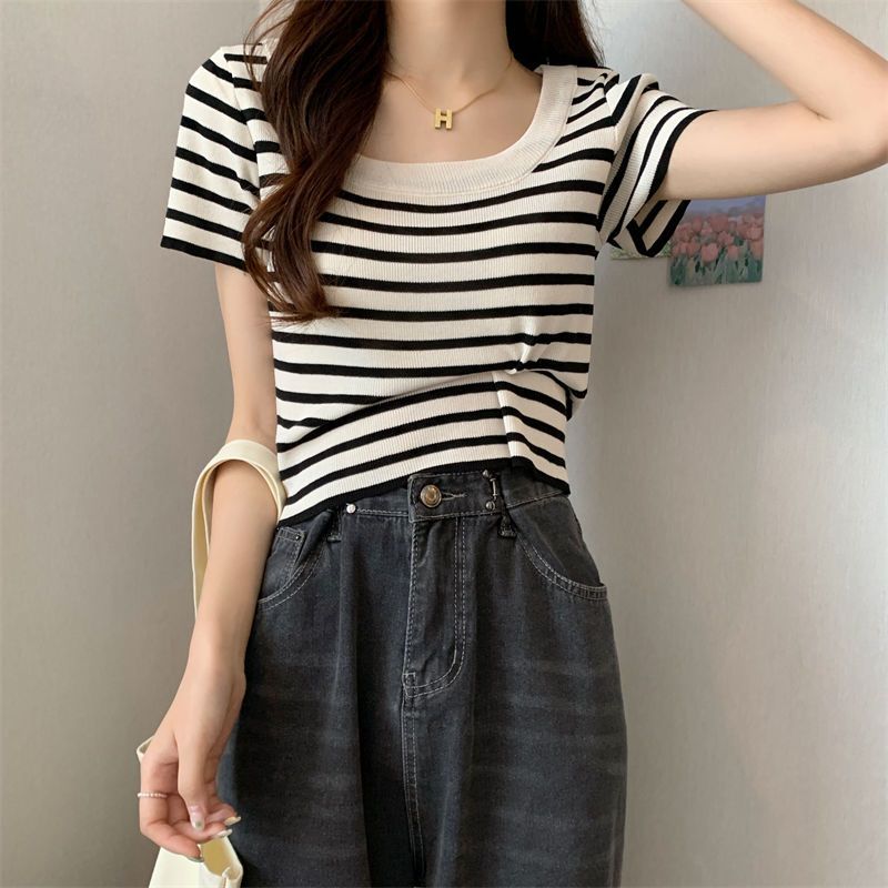 | nameOriginal | Black and White Striped Shoulder Square Collar Short-sleeved T-shirt Women's Summer Thin Design Sense Niche Bottoming Short Knitted Top |