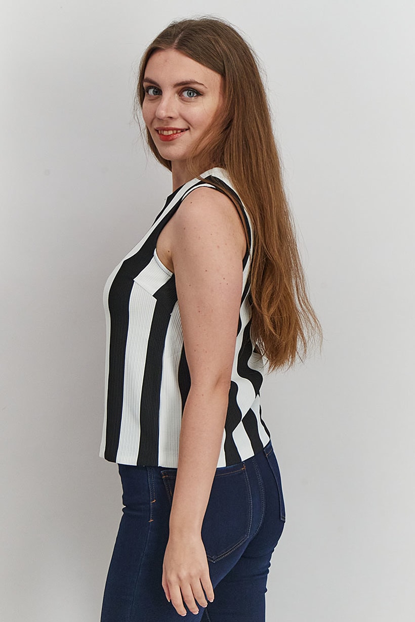 Women Round Neck Sleeveless Stripe Top, Black and White