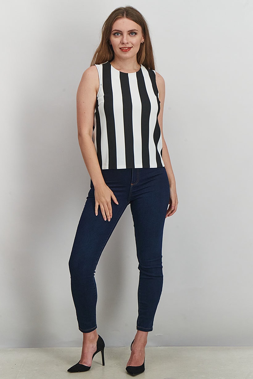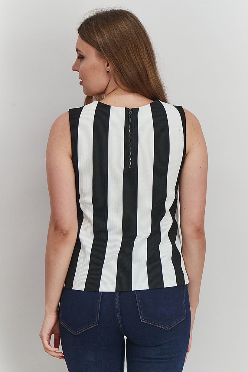 Care : Machine washable, Fit : Regular fit, Ideal For : Women, Size shown : International, Top Style : Blouse, Types of Hem : Straight hem, Types of Neckline & Collar : Round neckline, Types of Sleeve : Sleeveless, Fabrics : 97% Polyester, 3% Elastane, Occasion : Casual, Pattern & Print : Stripe, Types of Closures : Zipper closure, Color Family : Black,