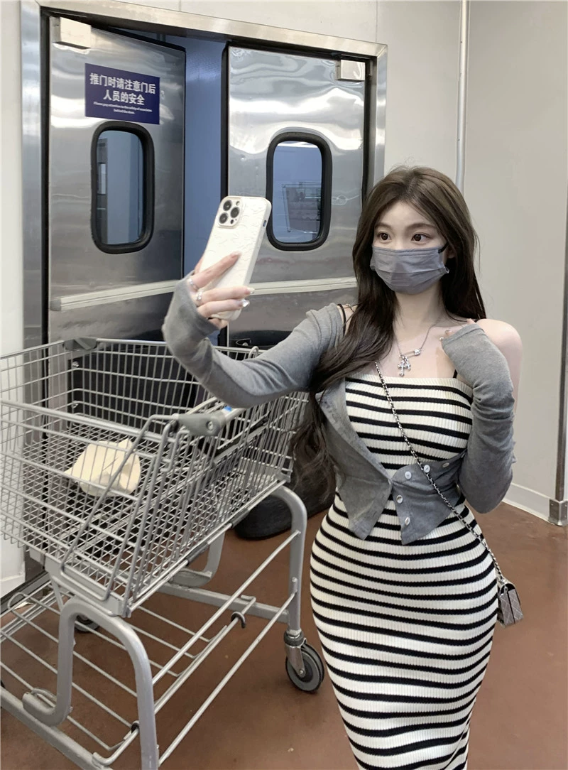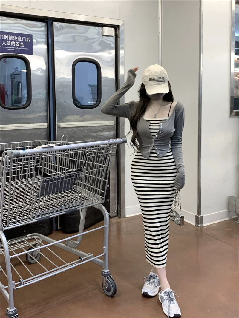 | nameOriginal | Black and white striped summer slim fit hip-hugging suspender dress |