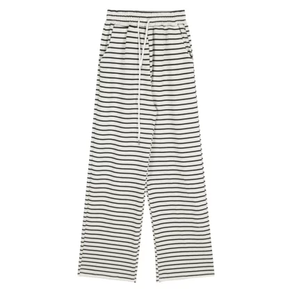 Black and white striped trousers loose high waist walk drawstring