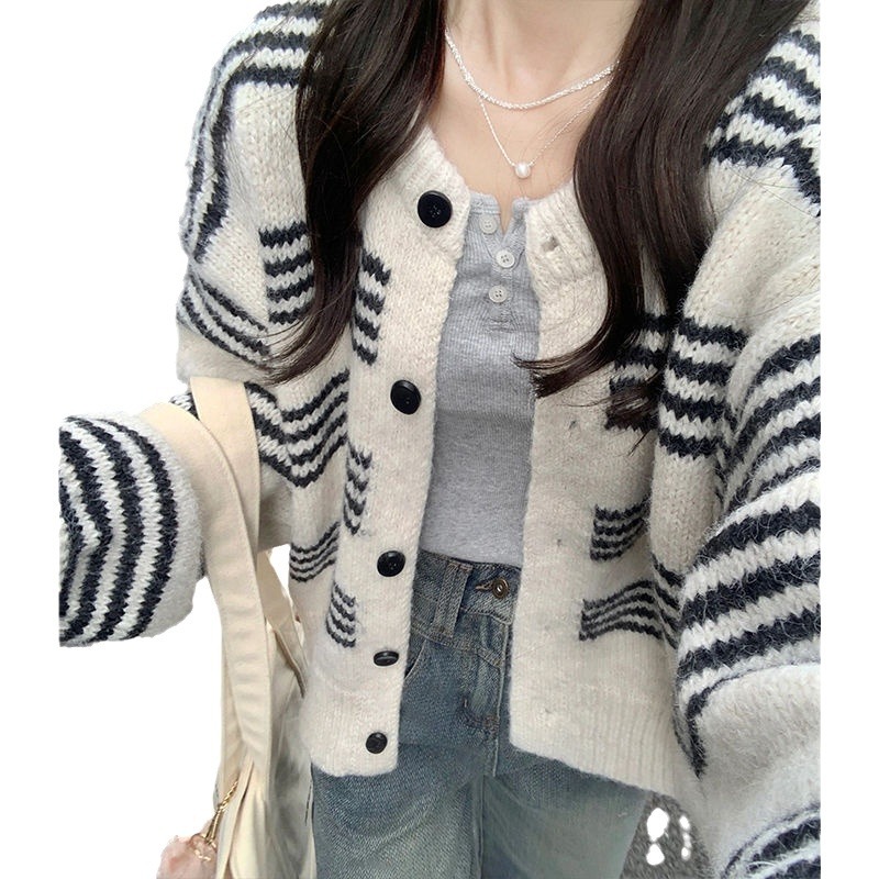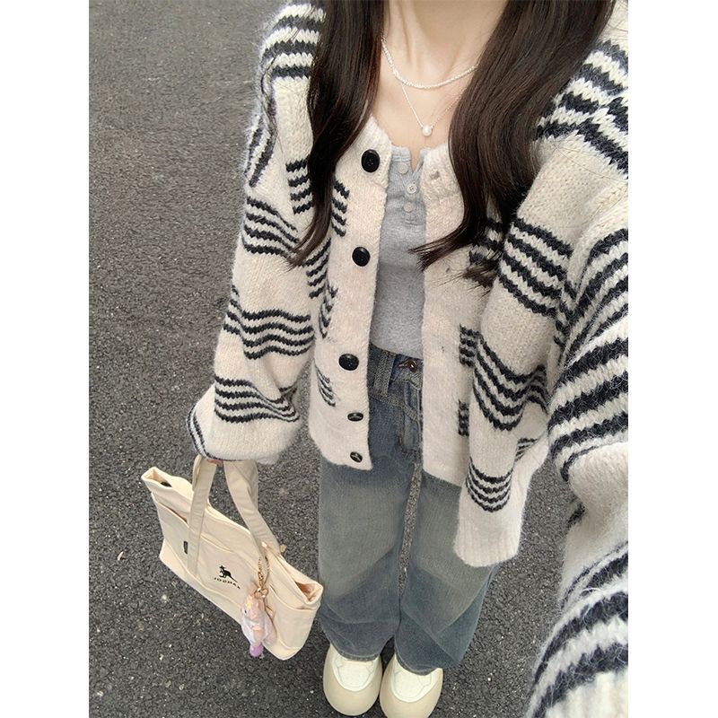 Black and White Vintage Striped Cardigan Sweater Women's Coat New Autumn and Winter Niche Loose Lazy Style Short Knitted Top