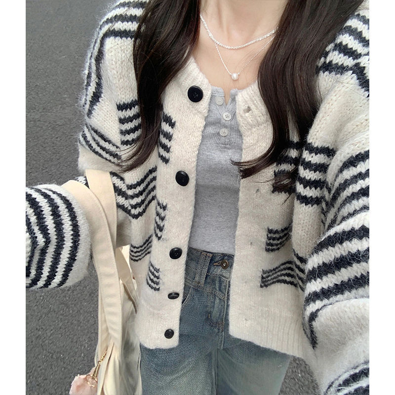 Black and White Vintage Striped Cardigan Sweater Women’s Coat New Autumn and Winter Niche Loose Lazy Style Short Knitted Top
