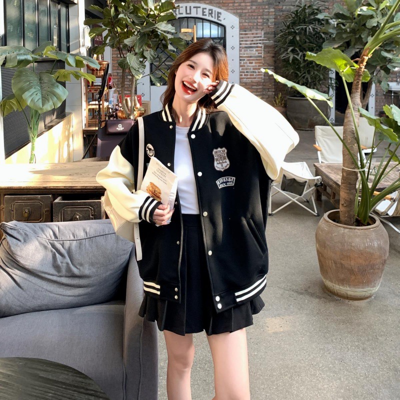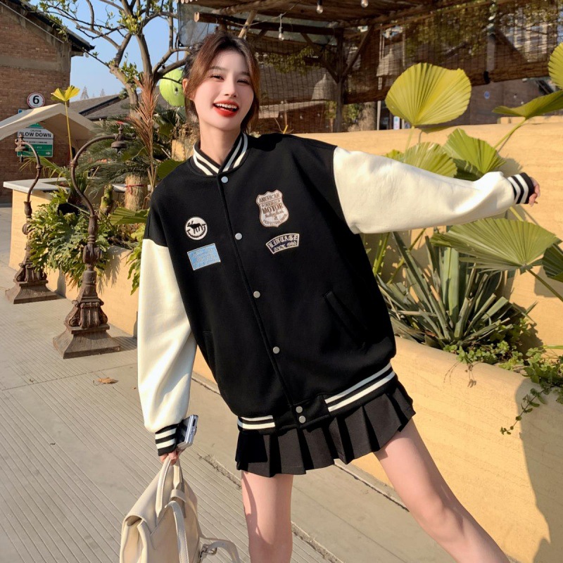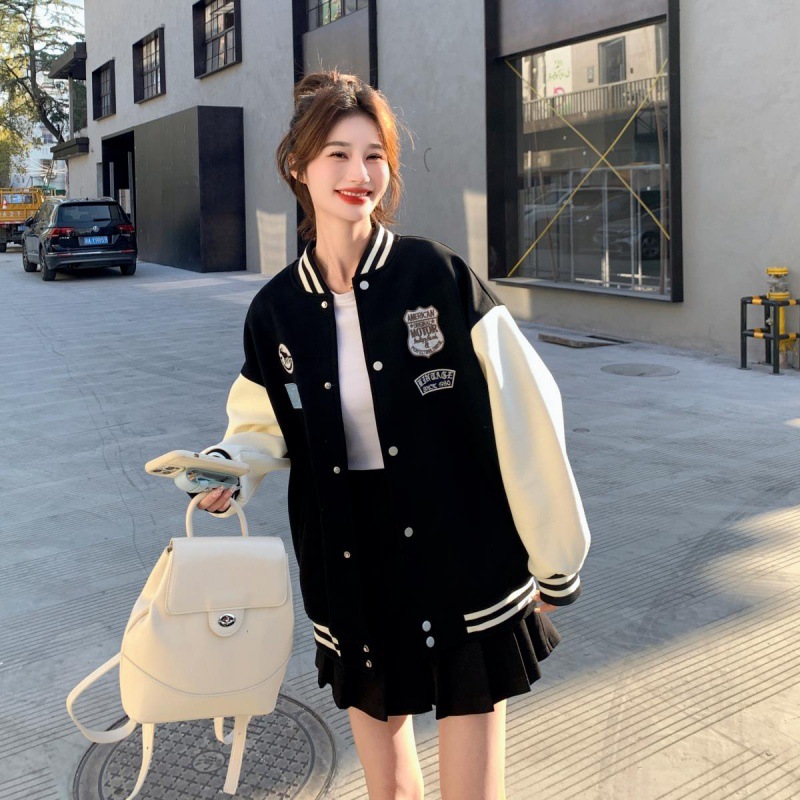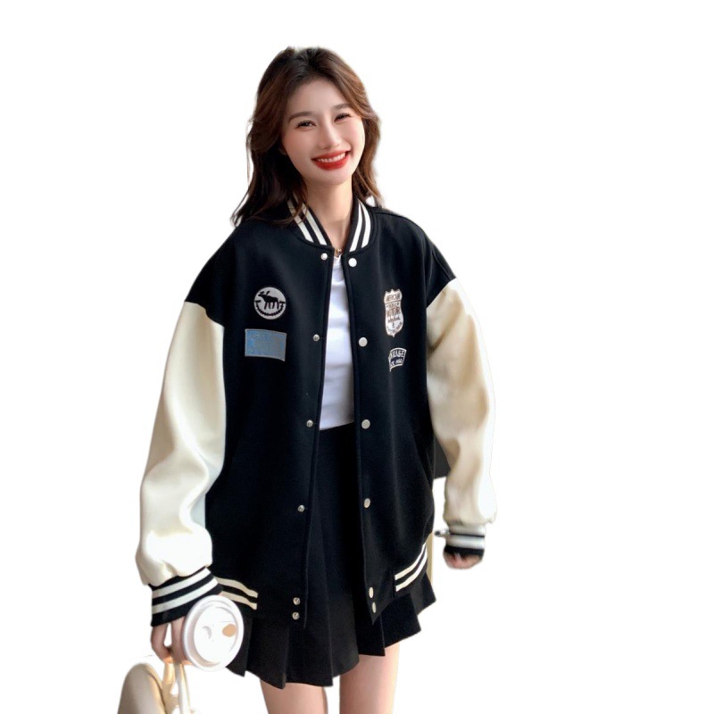 Black Baseball uniform for women Spring and Autumn 2024 New Small College casual loose batwing sleeve Hong Kong style retro jacket