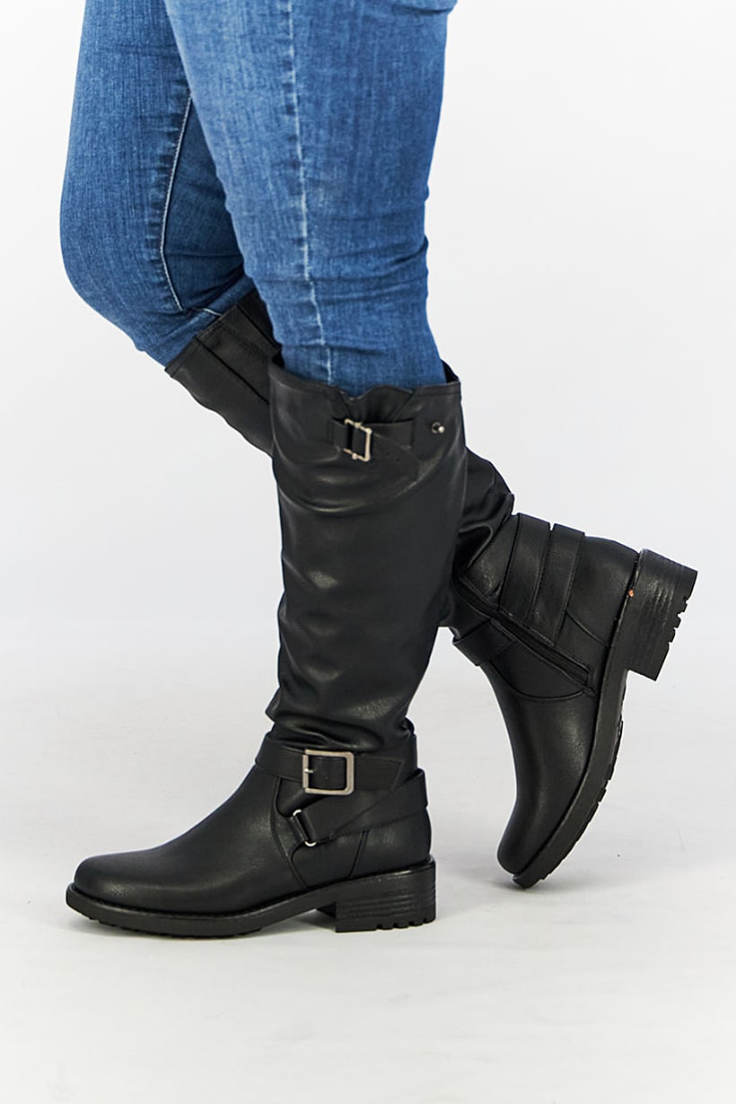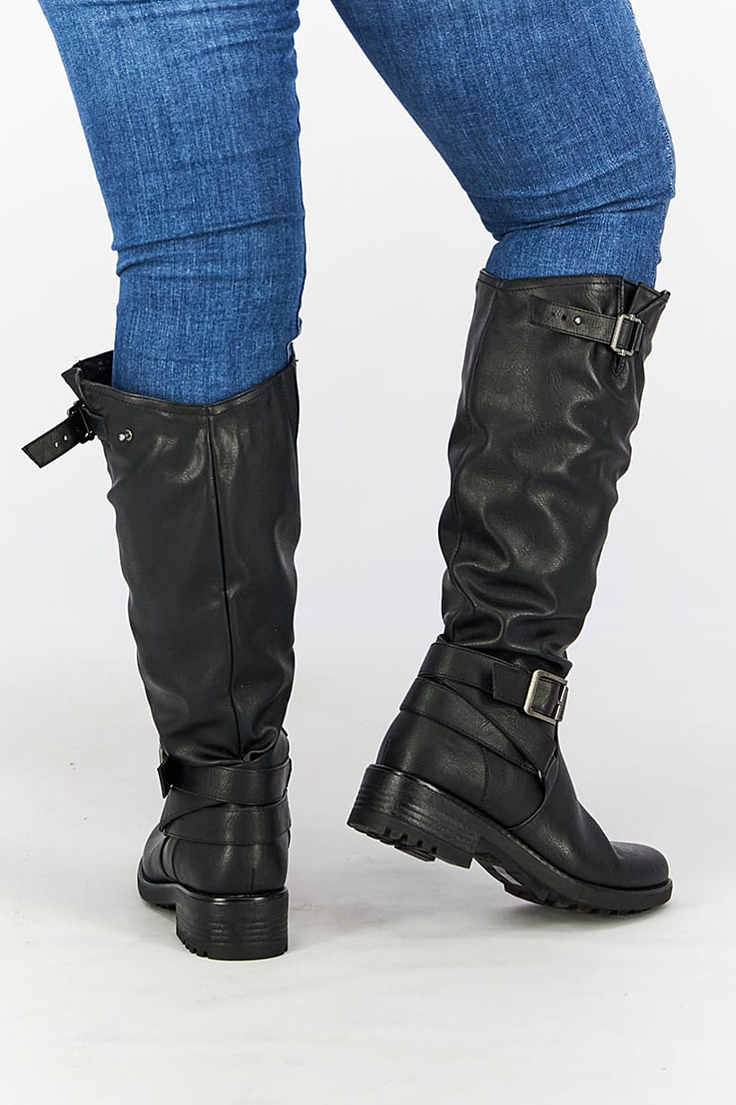 | descriptionOriginal | Heel Style : Block heel, Ideal For : Women, Shoe Closure : Adjustable buckle closure, Shoe Width : Medium, Sole Material : Synthetic sole, Toe Style : Almond toe, Disclaimer : Product color may slightly vary due to photographic lighting sources or your monitor settings., Occasion : Casual, Shoe Material : Synthetic Leather, Color Family : Black, Style : Calf-length boot, |