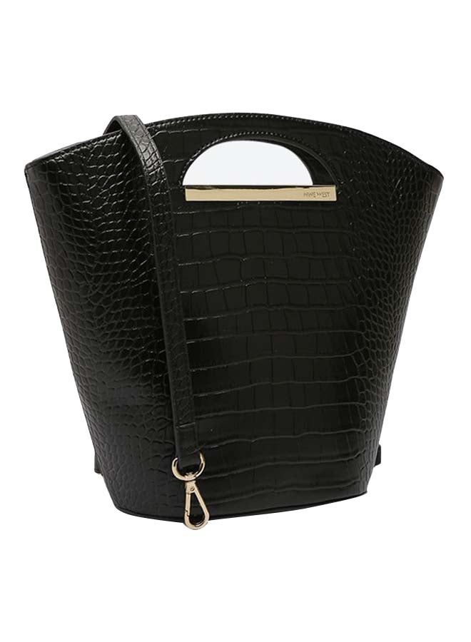 Black Bucket Bag with Zipper Closure and Cut-Out Detail.