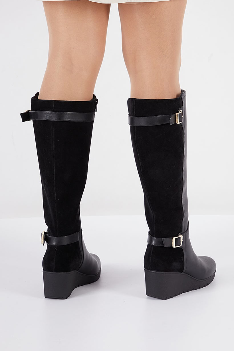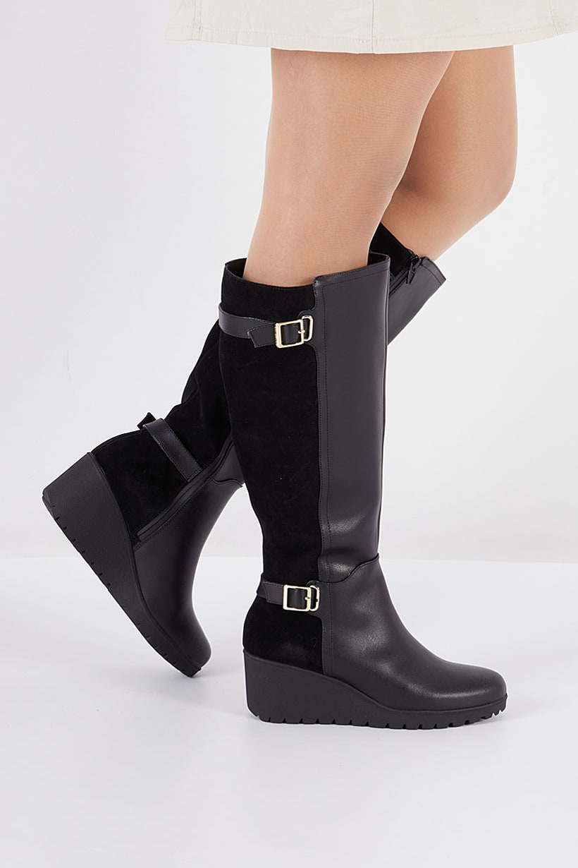 | descriptionOriginal | Heel Style : Wedge heel, Ideal For : Women, Shoe Closure : Zipper closure, Shoe Width : Medium, Sole Material : Synthetic sole, Style : Knee-length boot, Toe Style : Closed toe, Disclaimer : Product color may slightly vary due to photographic lighting sources or your monitor settings., Shoe Material : Leather, Color Family : Black, Occasion : Casual, |
