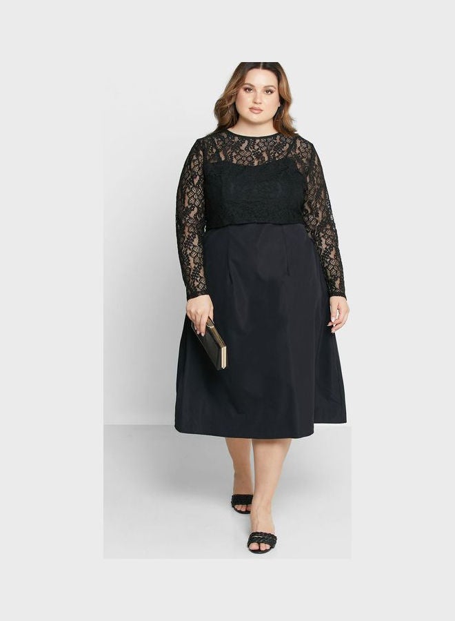 This product features a soft and cozy blend of polyester fabric that ensures maximum comfort. The bodice is adorned with a delicate lace panel overlay, adding a touch of elegance to the overall design. It has a round neckline and long sleeves, providing ample coverage. The reverse side is secured with a zipper closure, ensuring a snug fit. The dress falls to a midi length and has a flared hem style, making it a perfect choice for any occasion.
