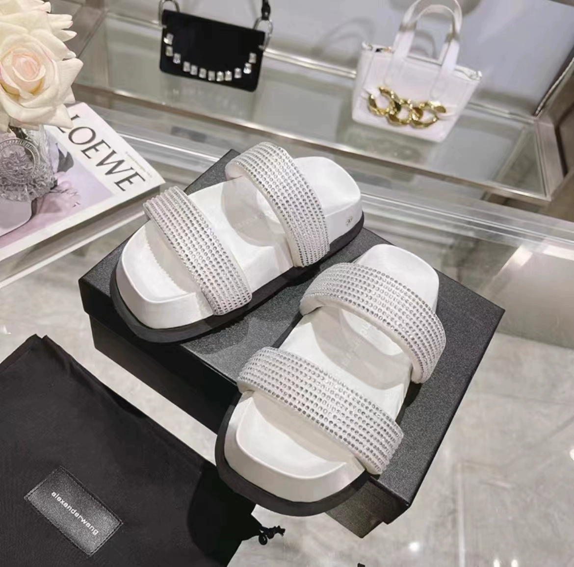 Black casual heightening rhinestone strap thick-soled slippers