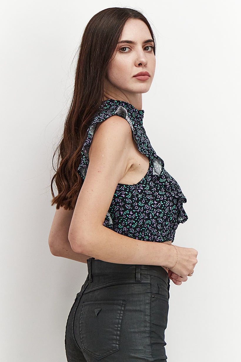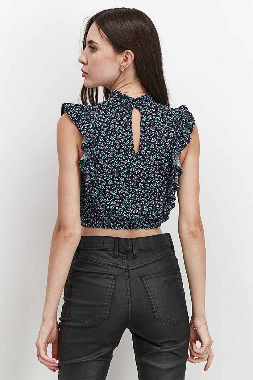 | sub_Categories | Women Clothing, Tops & Tees, women mock neck ruffle sleeves allover print top black combo |