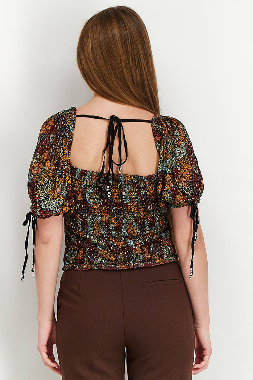 Women Square Neck Puff Sleeves Floral Crop Top, Black Combo