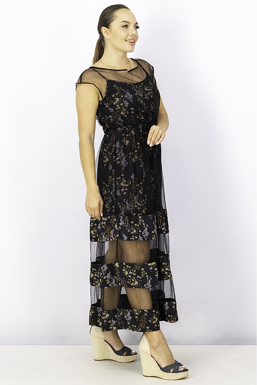 This product is easy to care for as it is machine washable. It is a midi dress with a regular fit and features a flared hem. The neckline is round and the collar is collarless. The dress has short sleeves and is made of 100% polyester. It is suitable for casual occasions and has a beautiful floral print. The dress is pullover style and comes in black color. The size shown is international.