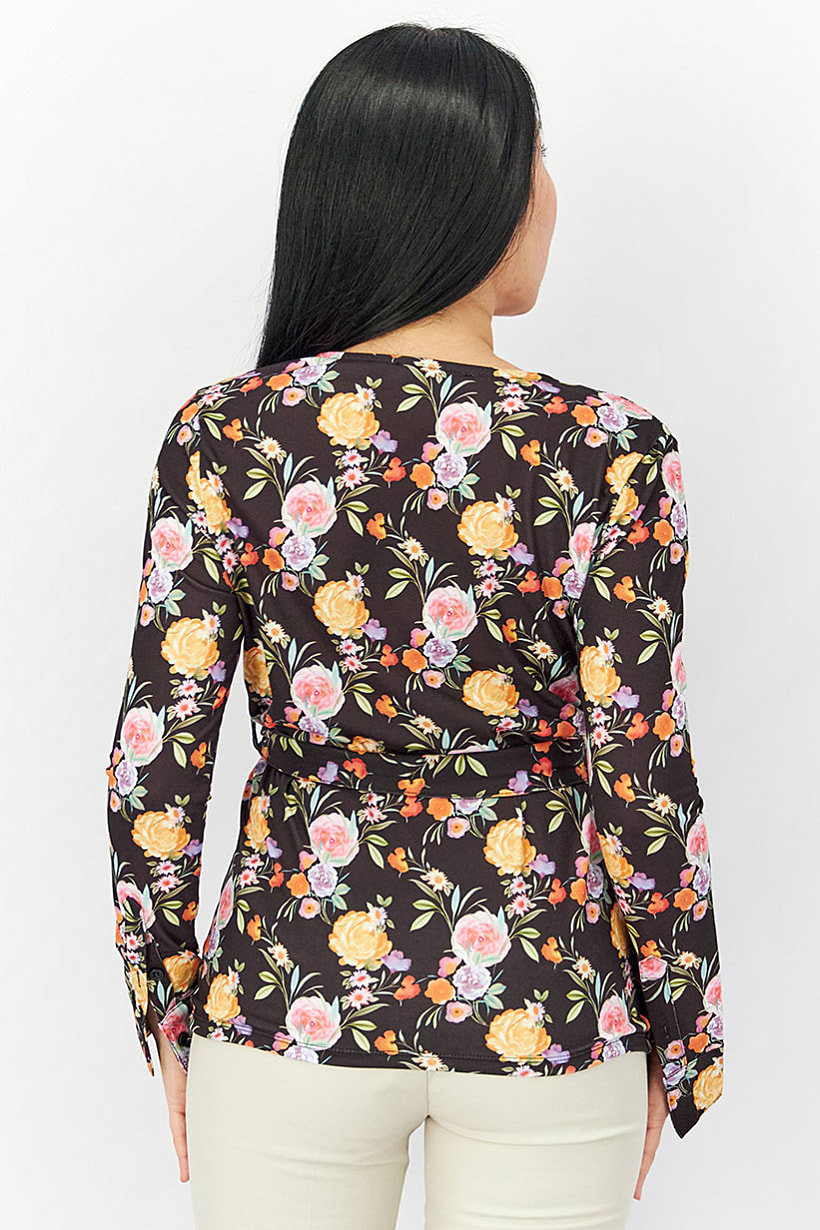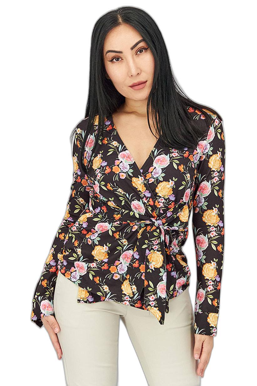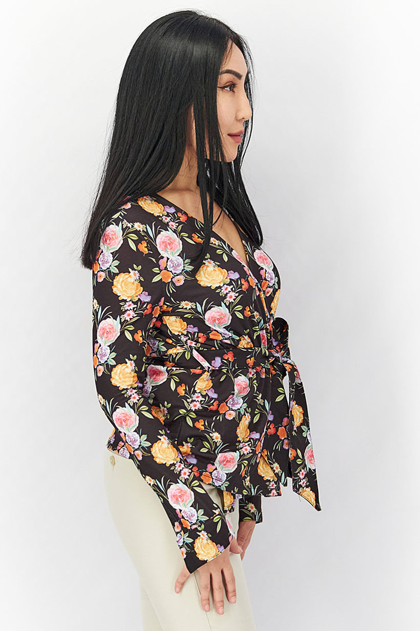 Black Combo Floral Print Wrap Blouse with V-neck, Long Sleeves and Belt.