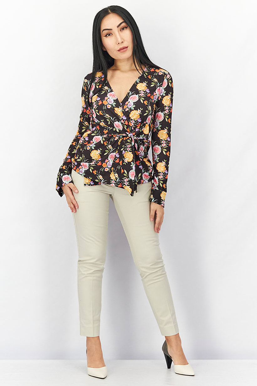 Care : Machine washable, Fit : Regular fit, Ideal For : Women, Size shown : International, Top Style : Wrap Top, Types of Hem : Straight hem, Types of Neckline & Collar : V-neckline, Types of Sleeve : Longsleeve, Disclaimer : Product color may slightly vary due to photographic lighting sources or your monitor settings., Fabrics : 95% Polyester, 5% Elastane, Occasion : Casual, Pattern & Print : Floral Print, Types of Closures : Tie closure, Color Family : Black,