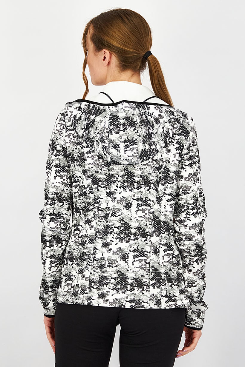 Care : Machine washable, Size shown : US, Thickness : Light, Types of Hem : Straight hem, Types of Neckline & Collar : Hood, Disclaimer : Product color may slightly vary due to photographic lighting sources or your monitor settings., Fabrics : 100% Polyester, Pattern & Print : Allover print, Types of Closures : Zipper closure, Color Family : Black, Types of Sleeve : Longsleeve, Sleeve Length : Long Sleeve, Occasion : Sport, Fit : Sportswear Fit, Sportswear Type : Jackets, Type of Sport : Outdoors,