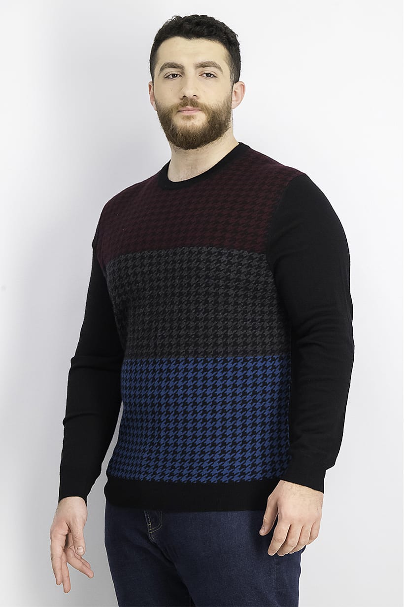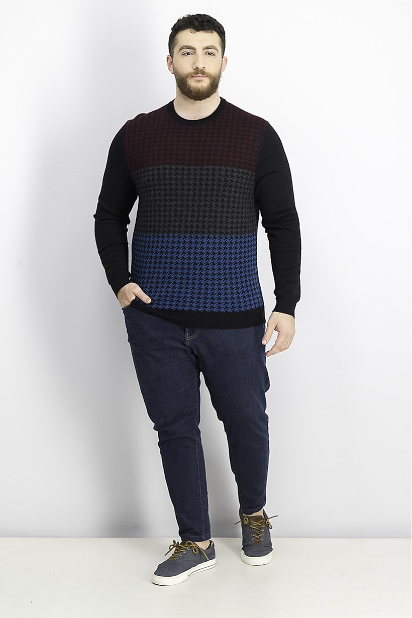 This product can be easily washed in a machine and the size displayed is in international measurements. It features a crew neckline and long sleeves, with a light thickness and a pullover closure. The sweatshirt style is designed with a houndstooth print and made from a blend of 52% Merino Wool and 48% Acrylic fabrics. Please note that the product color may appear slightly different due to photographic lighting or monitor settings.