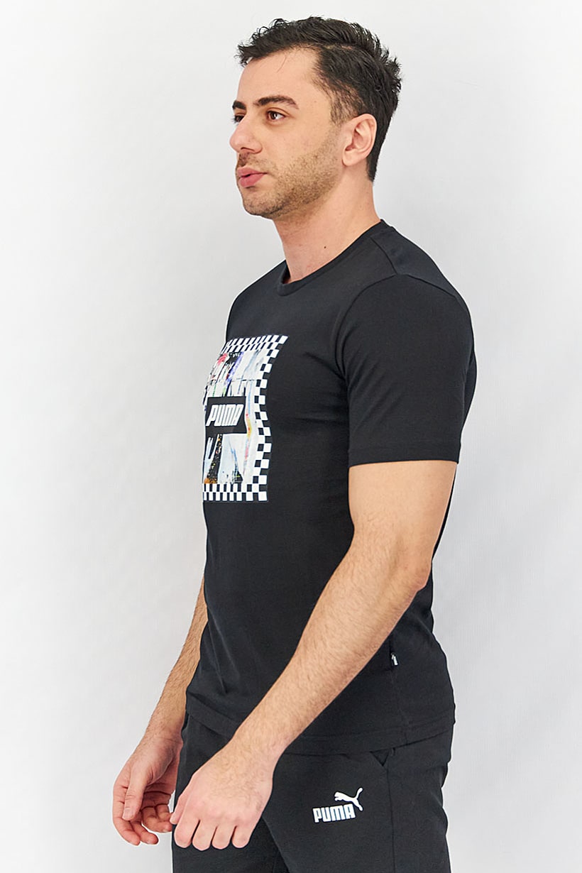 This sporty t-shirt is made of 100% cotton and is machine washable for easy care. It features a graphic print and a sportswear fit that is perfect for running. The pullover closure and light thickness make it comfortable to wear during any sport occasion. Please note that the product color may vary slightly due to photographic lighting sources or monitor settings. Available in US sizing and black color family.