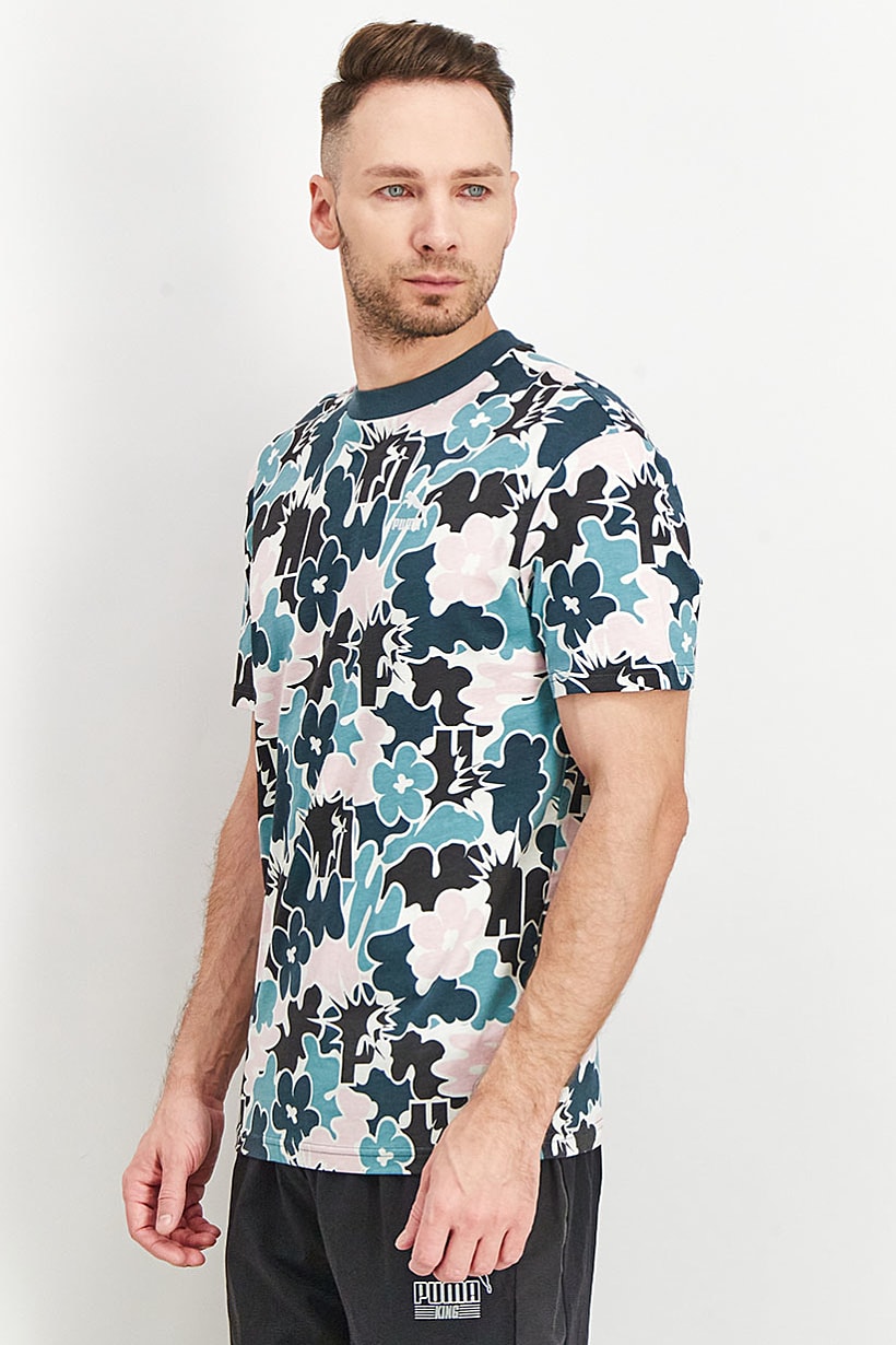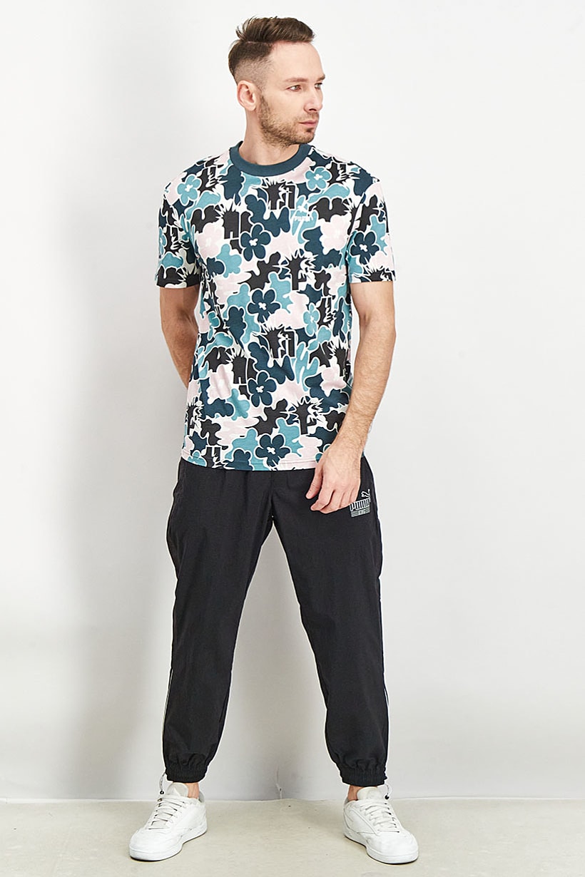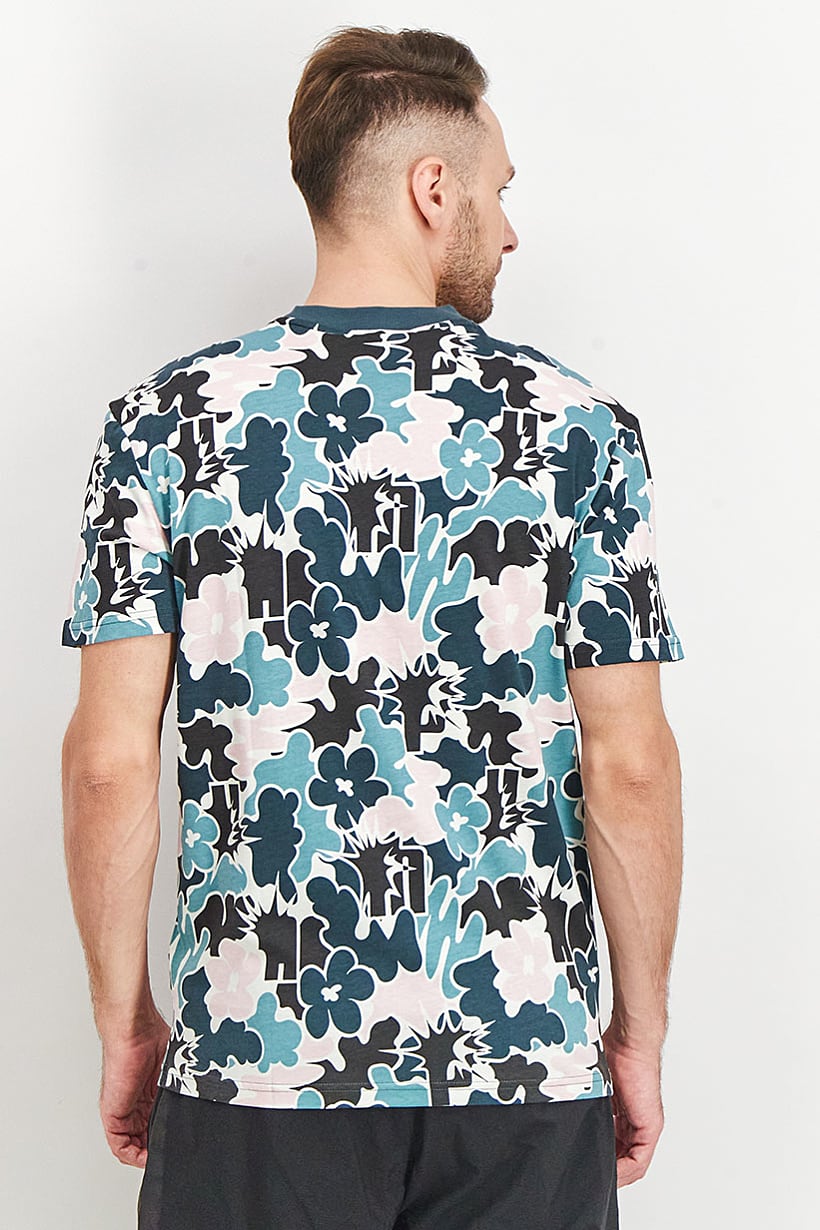 This product is easy to care for as it is machine washable. It has a sportswear fit and is available in US sizes. The fabric is made of 100% cotton and is light in thickness, making it suitable for training. The t-shirt features an allover print and is categorized as sportswear. It comes in the color black.