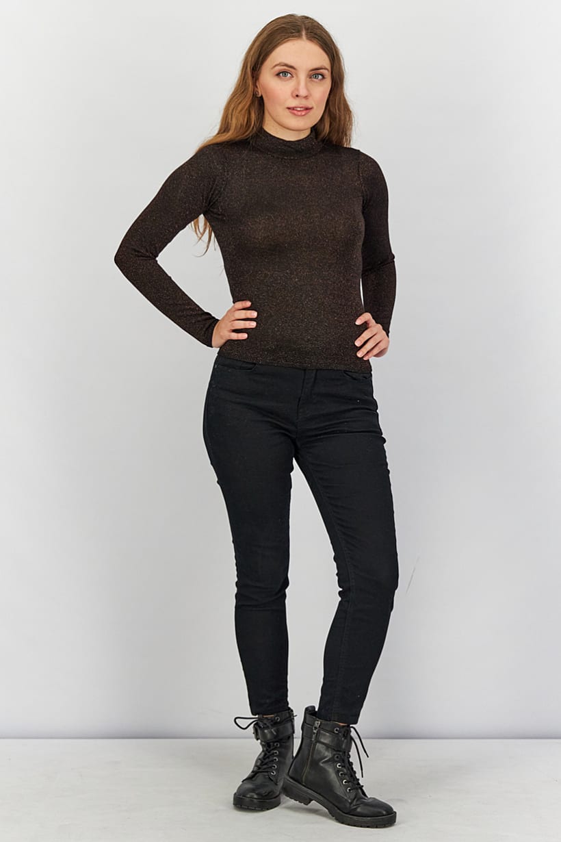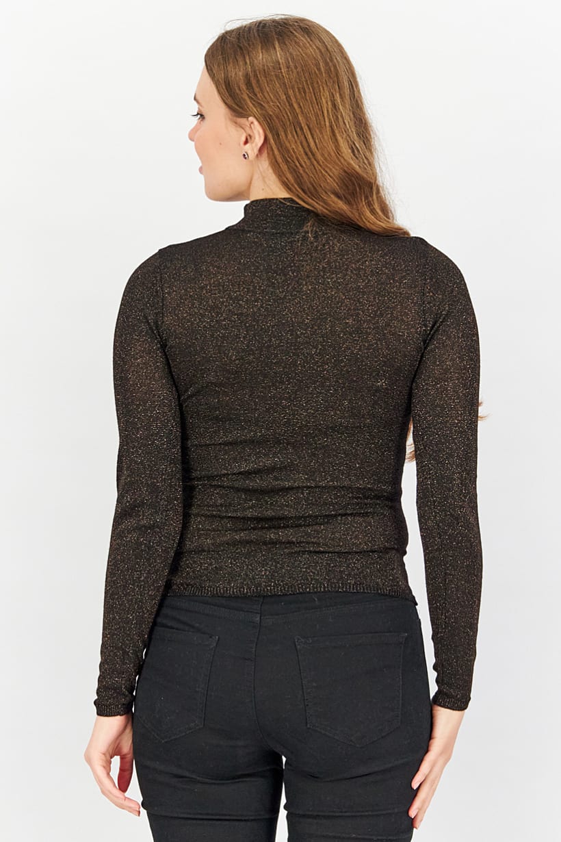 Black Combo Metallic Long Sleeve Mock Neck Top for Women.