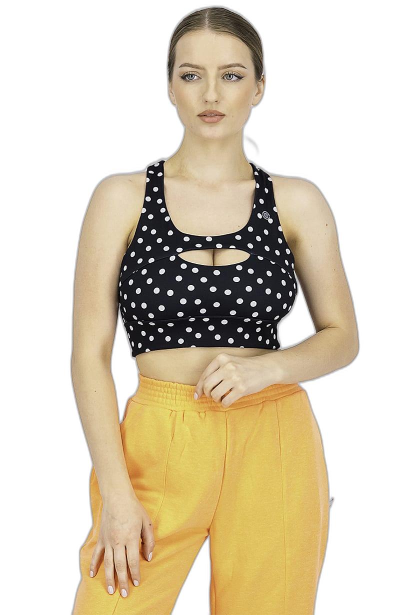 | descriptionOriginal | Care : Machine washable, Fit : Sportswear Fit, Size shown : International, Thickness : Light, Type of Sport : Training, Disclaimer : Product color may slightly vary due to photographic lighting sources or your monitor settings., Fabrics : 88% Polyester, 12% Spandex, Pattern & Print : Polka Dots, Sportswear Type : Sports Bra, Color Family : Black, |