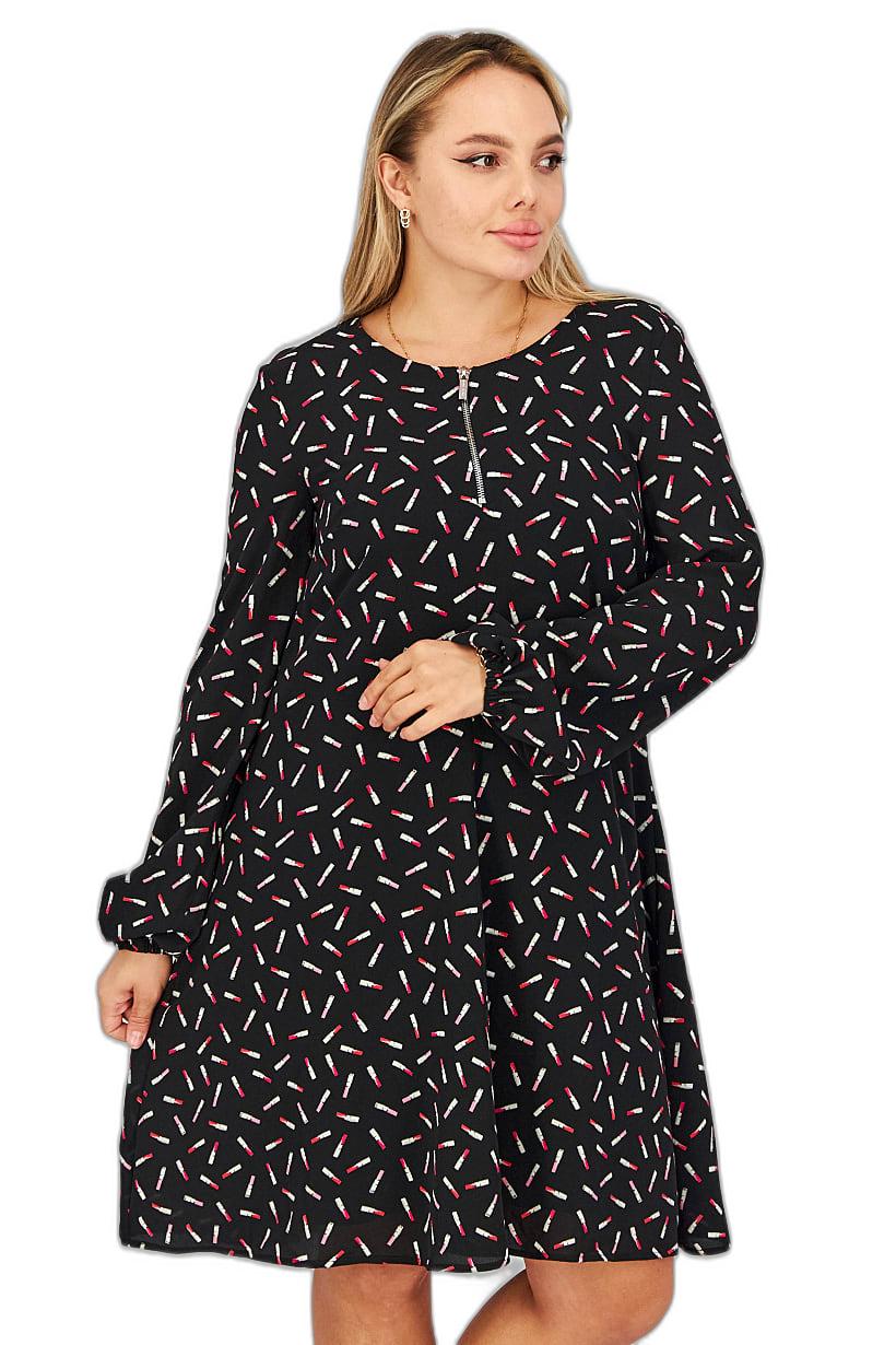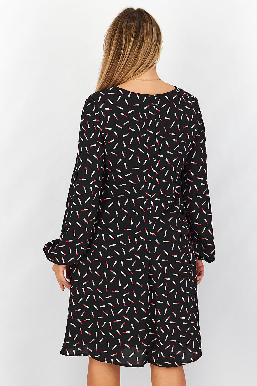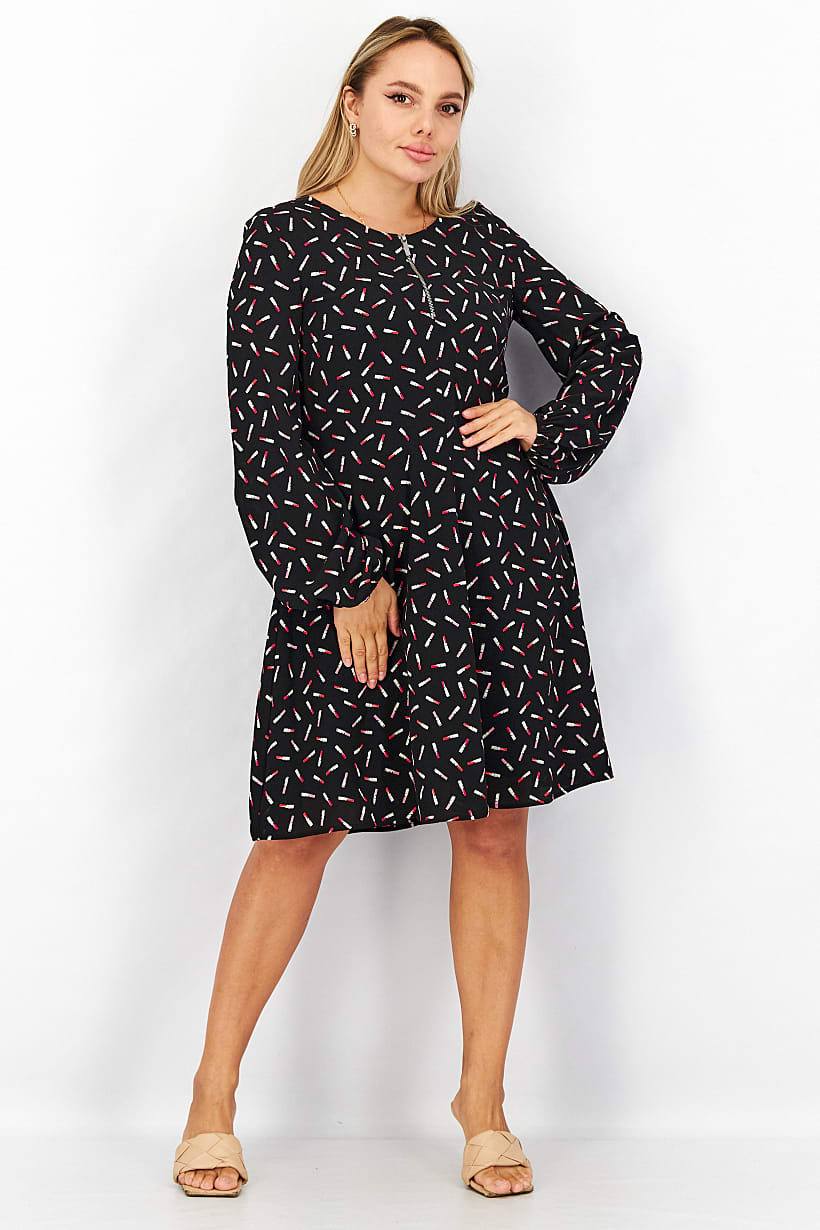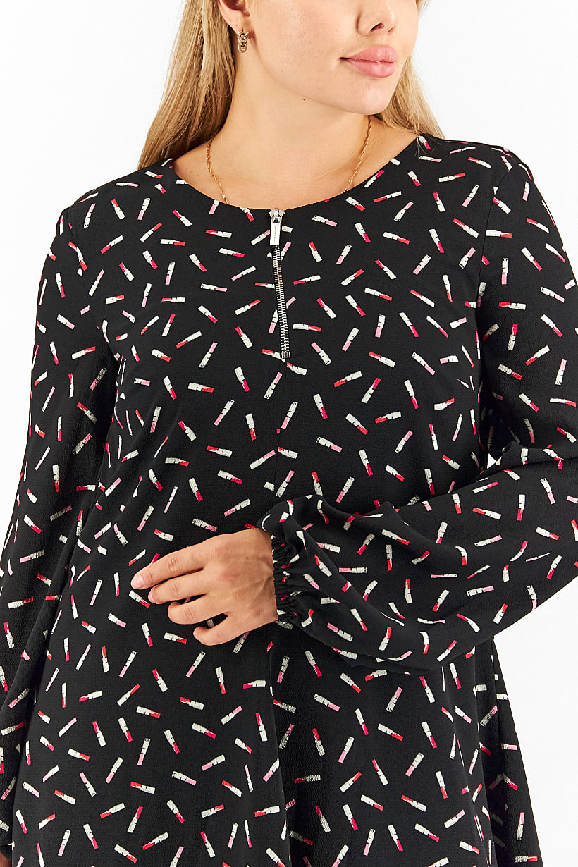 This product is suitable for women and features a regular fit with a mini dress style. It has a round neckline and long sleeves, with a straight hem and zipper closure. The allover print adds a stylish touch to the black color family. The fabric is made of 98% polyester and 2% elastane, and can be machine washed. Please note that the product color may vary slightly due to lighting or monitor settings.