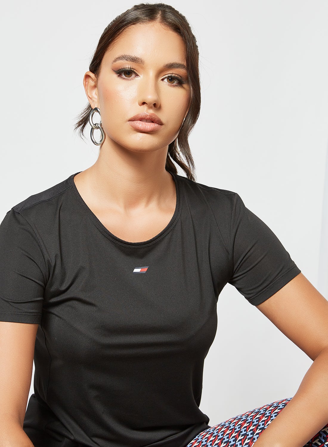 This product features a fabric blend of recycled polyester that is stretchable for a comfortable fit. It also includes moisture-wicking technology to keep you dry and comfortable. The crew neck and short sleeves provide a classic look, while the mesh panel inserts on the reverse add a stylish touch. The Tommy Hilfiger branding logo is also included. Please follow the care label instructions when washing.