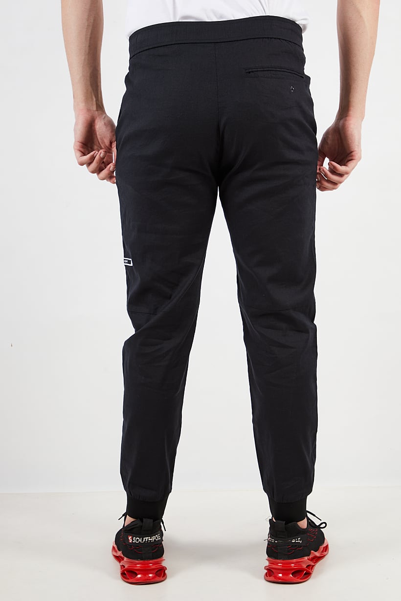 Care : Machine washable, Fit : Regular fit, No of pockets : 2, Pant Style : Joggers, Size shown : International, Stretch Type : Stretchable, Types of Jeans Rise : Low rise, Bottom Closure : Drawstring, Bottom Style/Pattern : Side pockets, Disclaimer : Product color may slightly vary due to photographic lighting sources or your monitor settings., Fabrics : 60% Linen, 37% Lyocell, 3% Elastane, Occasion : Casual, Pattern & Print : Graphic print, Color Family : Black,