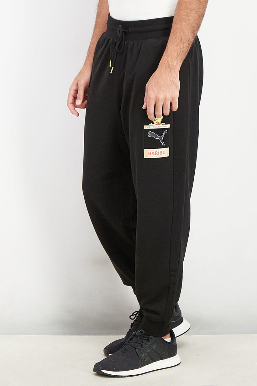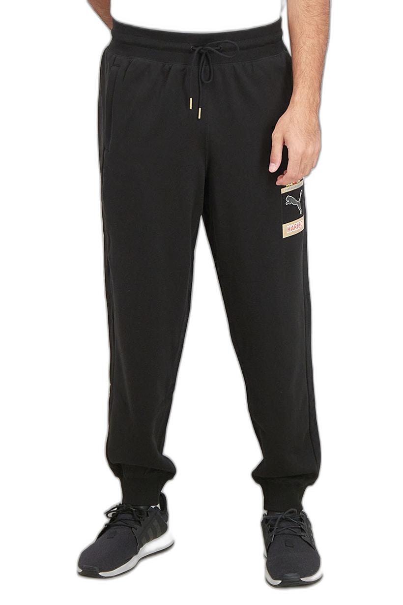 These track pants are designed for training and have a sportswear fit. The elasticized bottom hem and drawstring closure provide a comfortable and secure fit. They are made of 100% cotton and are machine washable. The brand logo is featured in the pattern and print, and the color is black. These pants are lightweight and perfect for athletic activities. The size shown is international.