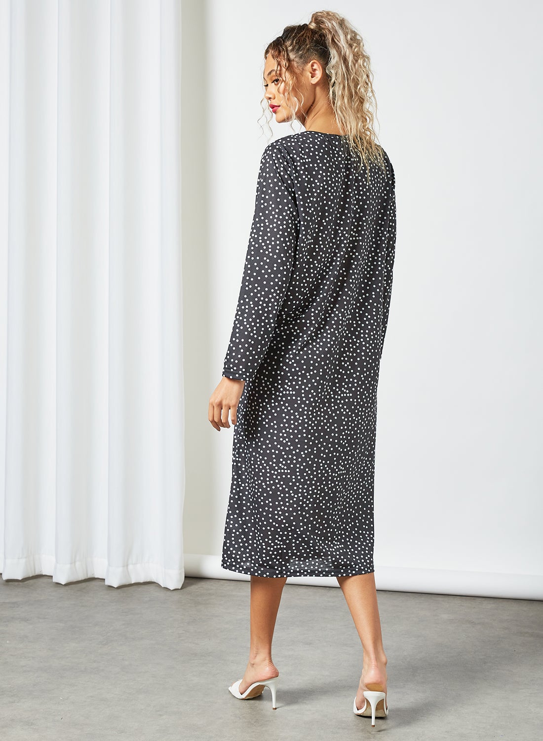 This product features a comfortable and flexible viscose material that stretches easily. It is adorned with a charming polka dot pattern throughout and comes with a round neckline and long sleeves. The relaxed fit and midi length make it a perfect choice for any occasion. Please follow the care label instructions when washing.