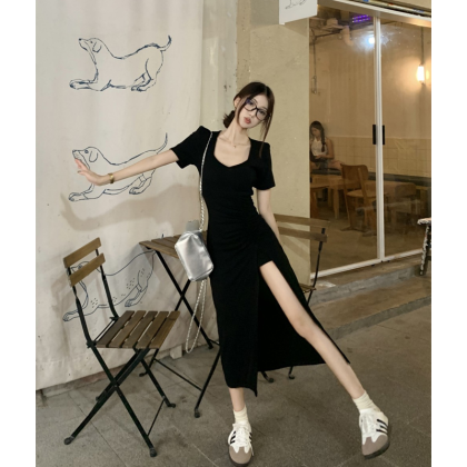 | nameOriginal | Black dress women's summer slim slit knitted short sleeves |