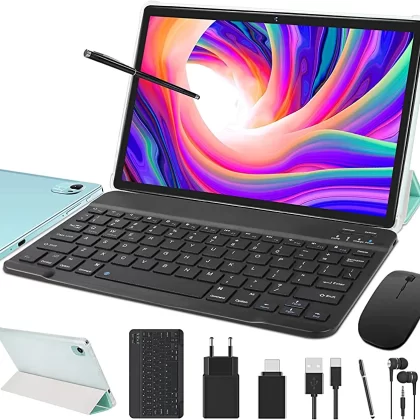 The package includes a 10-inch Android tablet in black, a dark grey protective case, a USB-C cable, a keyboard and mouse, a user manual, a charger and Type-C, a protective film, and a Snap Pin.