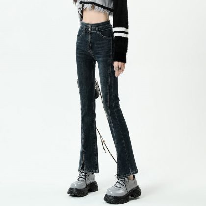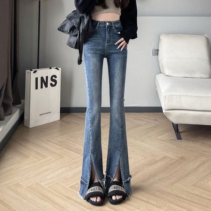 Black Flared Pants Women’s Micro-split Jeans Spring and Autumn 2024 New High Waist Slimming Small 9-point Pants