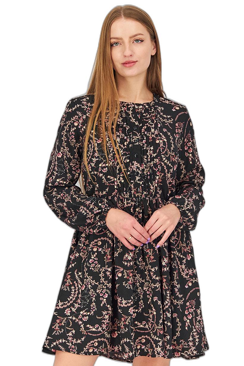 Care : Machine washable, Dress Style : Mini, Fit : Regular fit, Size shown : EU, Types of Hem : Straight hem, Types of Neckline & Collar : Round neckline, Types of Sleeve : Longsleeve, Fabrics : 100% Polyester, Occasion : Casual, Pattern & Print : Floral Print, Types of Closures : Pullover, Color Family : Black,