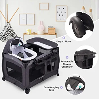 This multifunctional play area includes a detachable bassinet, soft sleeping nest, wipe-clean changing table, and sturdy diaper organizer, providing a 5-in-1 practical crib that you’ll love. The playard is also designed with 2 wheels with brakes, making it easy to move around as needed.