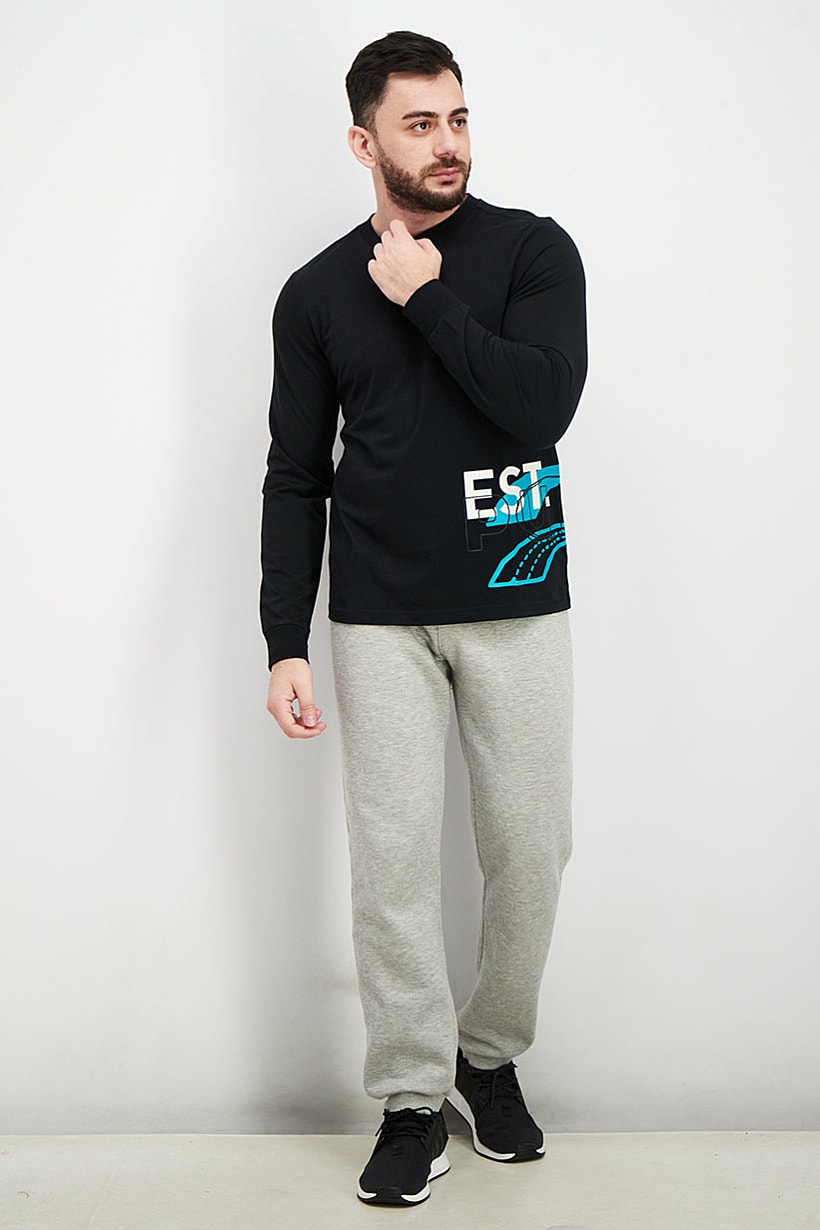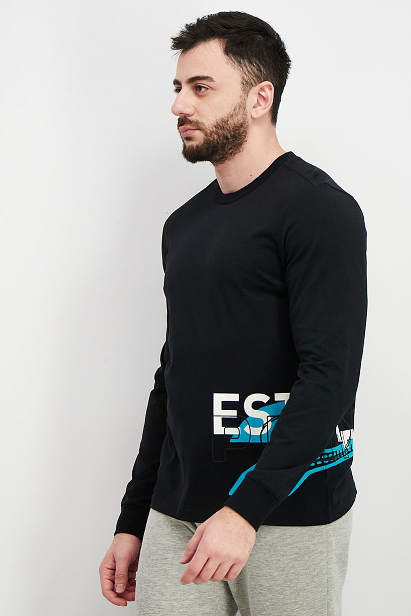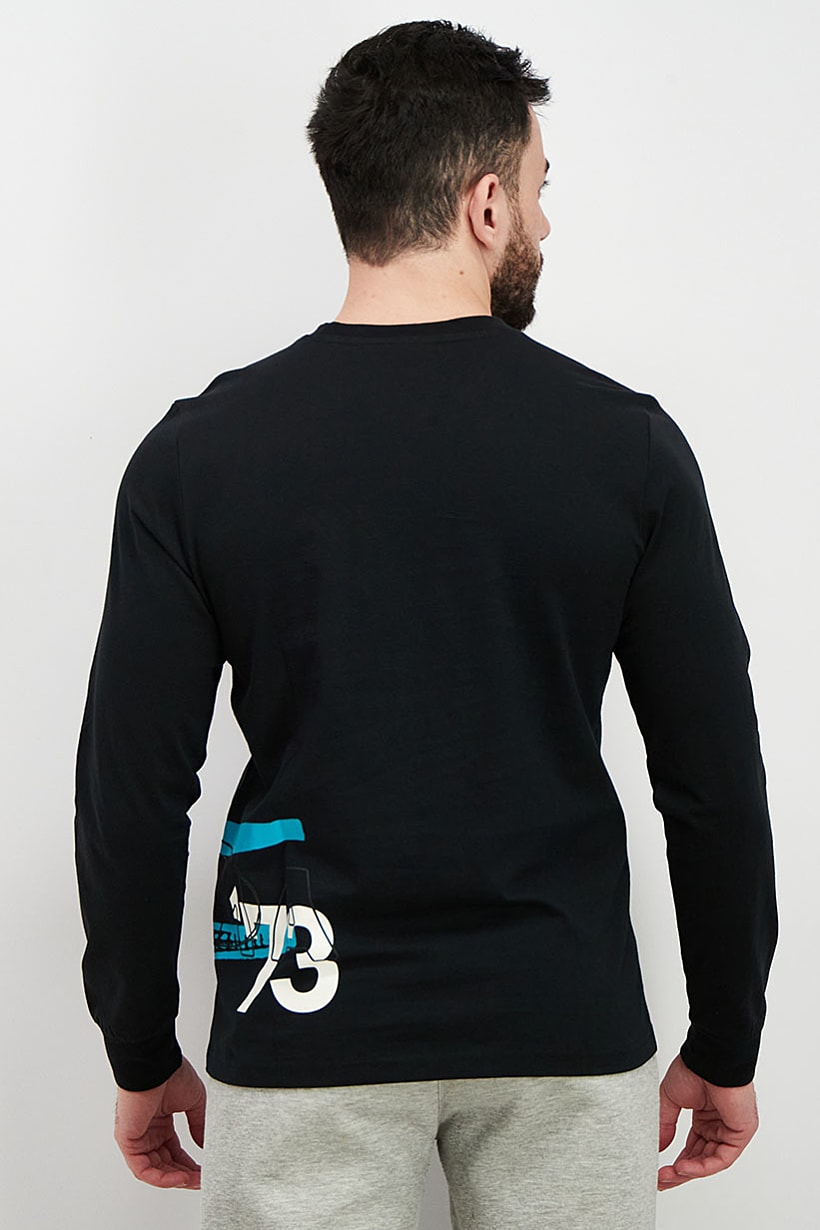 Care : Machine washable, Fit : Regular fit, Size shown : International, Sleeve Length : Long Sleeve, Type of Neckline & Collar : Crew neckline , Fabrics : 100% Cotton, Pattern & Print : Graphic print, Types of Closures : Pullover, Color Family : Black, Bottom Hem : Straight, Thickness : Light, Type of Sport : Training, Sportswear Type : T-Shirt,