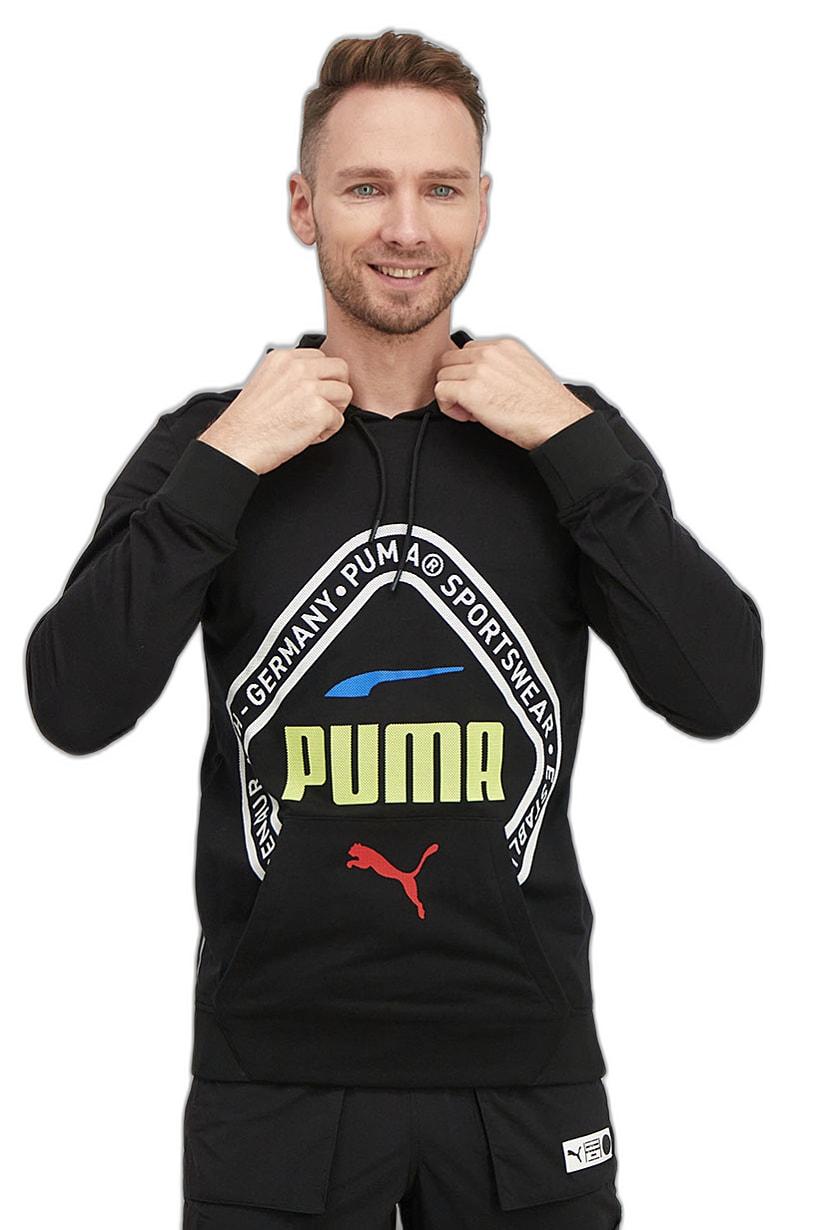 This product is machine washable and has a sportswear fit. The size shown is in US measurements and it features long sleeves with a medium thickness. The neckline and collar are a hood with drawstrings, making it suitable for training. Please note that the product color may slightly vary due to photographic lighting sources or monitor settings. The fabric is made of 64% cotton and 36% polyester with a graphic print pattern. This is a pullover hoodie in the color black, perfect for sportswear.
