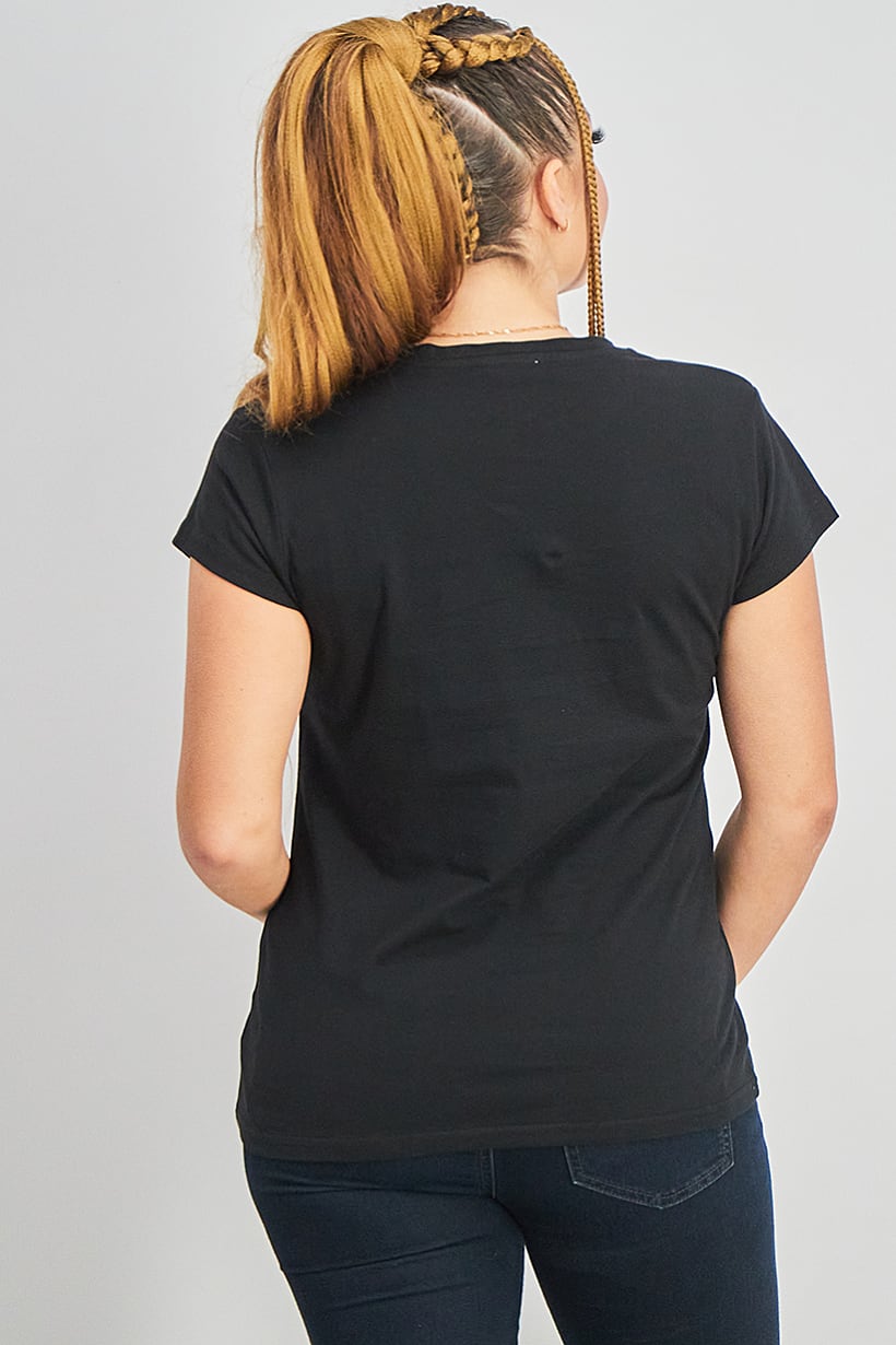 Care : Machine washable, Fit : Regular fit, Ideal For : Women, Size shown : International, Types of Hem : Straight hem, Types of Neckline & Collar : Crew neckline, Types of Sleeve : Short sleeve, Disclaimer : Product color may slightly vary due to photographic lighting sources or your monitor settings., Fabrics : 100% Cotton, Occasion : Casual, Pattern & Print : Graphic print, Types of Closures : Pullover, Color Family : Black, Top Style : T-Shirt,