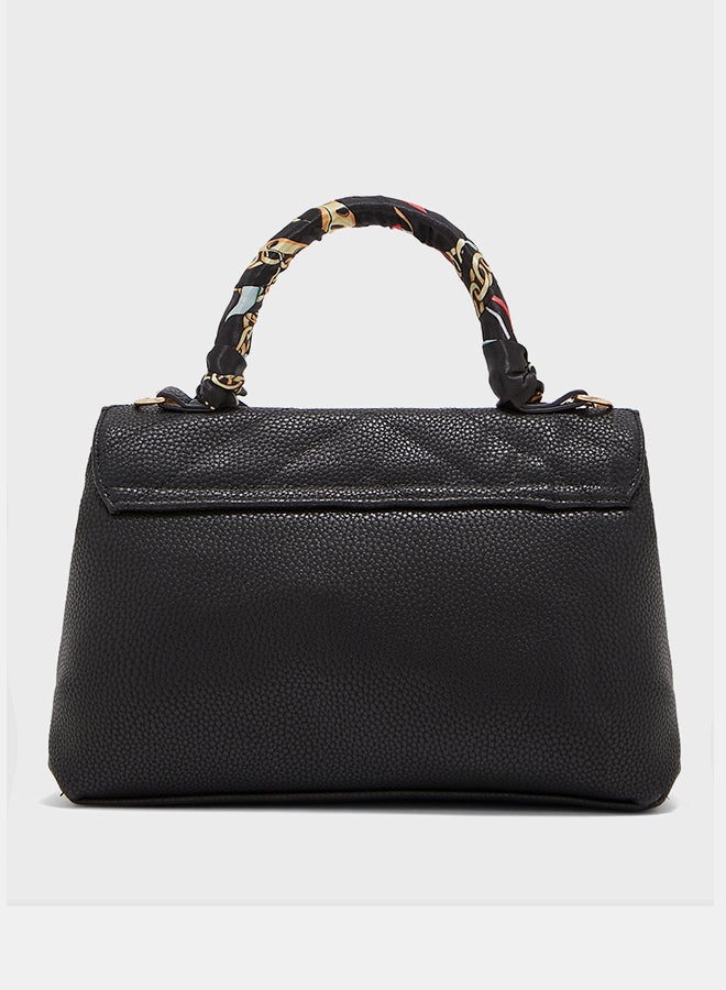 Black Handbag with Quilted Texture and Scarf Embellishment.