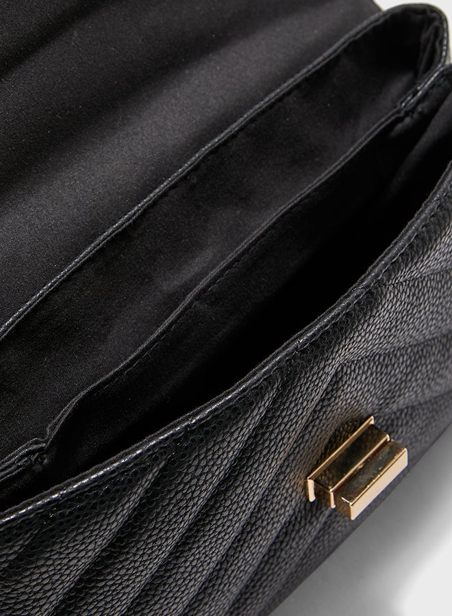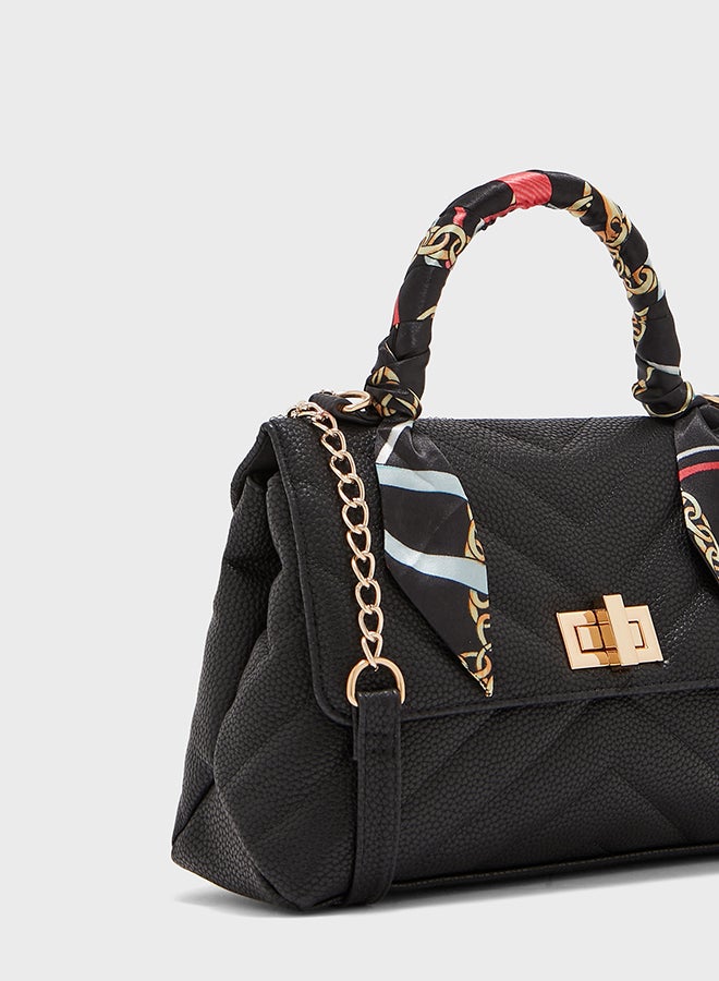 Introducing our stylish and versatile Quilted Handbag with Scarf Detail in Black. This handbag is the perfect accessory for any fashion-forward woman who wants to add a touch of sophistication to her outfit. The quilted design adds a classic and timeless look, while the black color makes it easy to match with any outfit. The scarf detail adds a pop of color and texture, making it a unique and eye-catching piece. The bag is spacious enough to carry all your essentials, with multiple compartments to keep your belongings organized. The adjustable strap allows you to wear it as a shoulder or crossbody bag, making it perfect for any occasion. Made with high-quality materials, this handbag is durable and long-lasting. Elevate your style with our Quilted Handbag with Scarf Detail in Black.