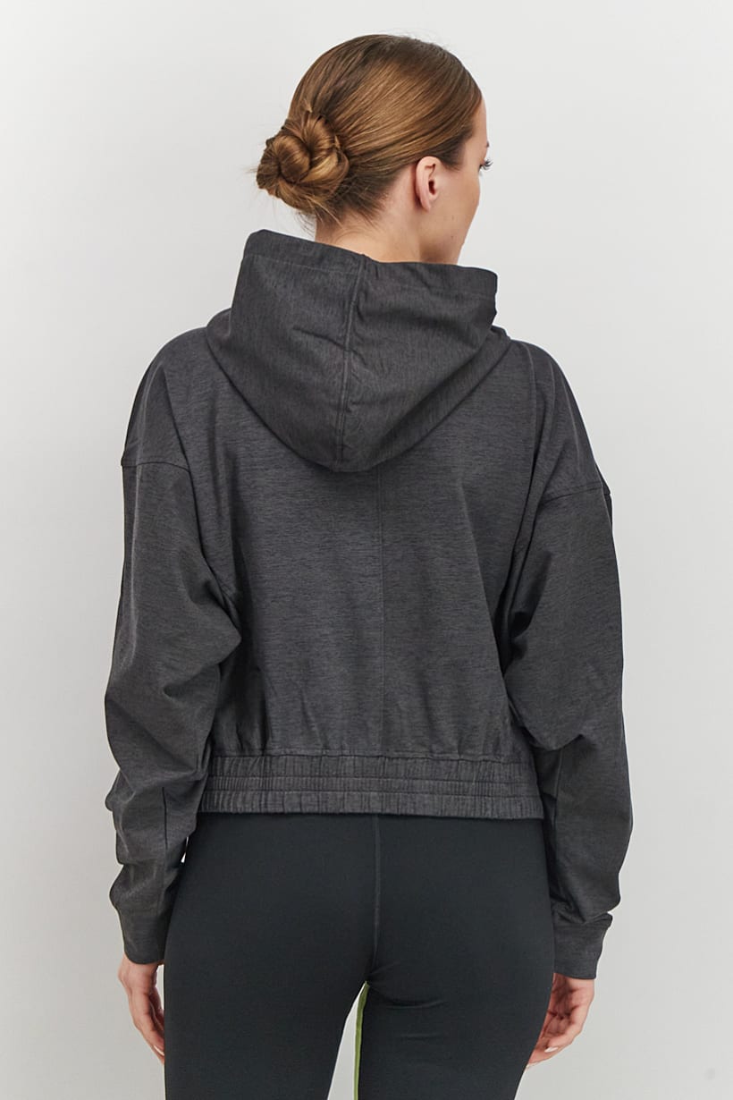 Bottom Hem : Straight, Care : Machine washable, Fit : Relaxed fit, Size shown : US, Thickness : Light, Type of Sport : Training, Types of Neckline & Collar : Hood with drawstrings, Types of Sleeve : Longsleeve, Disclaimer : Product color may slightly vary due to photographic lighting sources or your monitor settings., Fabrics : 87% Polyester, 13% Elastane, Occasion : Sport, Pattern & Print : Heather, Sportswear Type : Jackets, Types of Closures : Zipper closure, Color Family : Black,