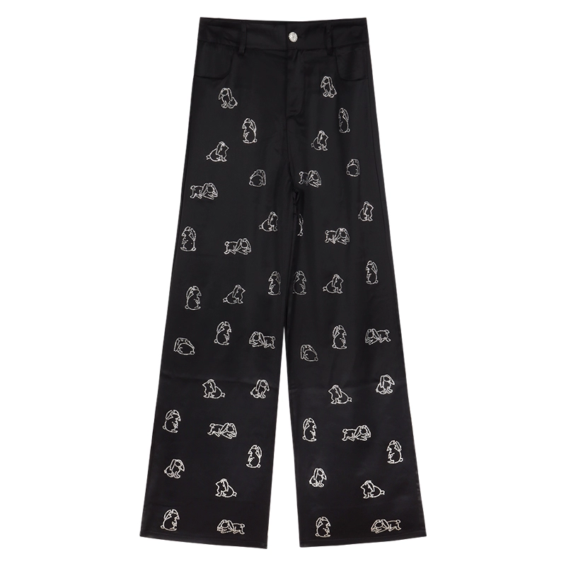 | nameOriginal | Black high-waisted trousers, loose and drapey, floor-length, permed |