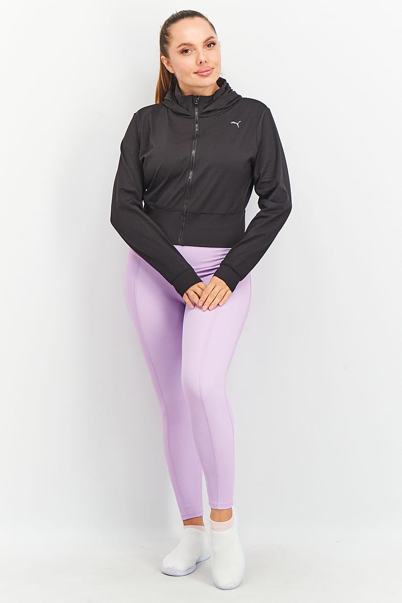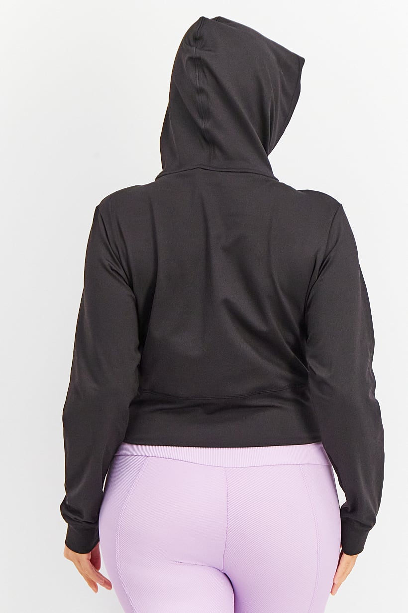 Care : Machine washable, Fit : Sportswear Fit, Ideal For : Women, Padding : No, Size shown : US, Sleeve Length : Long Sleeve, Thickness : Light, Type of Sport : Outdoors, Types of Hem : Straight hem, Types of Neckline & Collar : Hood, Types of Sleeve : Longsleeve, Disclaimer : Product color may slightly vary due to photographic lighting sources or your monitor settings., Fabrics : 87% Polyester, 13% Elastane, Occasion : Sport, Pattern & Print : Brand Logo, Sportswear Type : Sweatshirts, Types of Closures : Zipper closure, Color Family : Black,