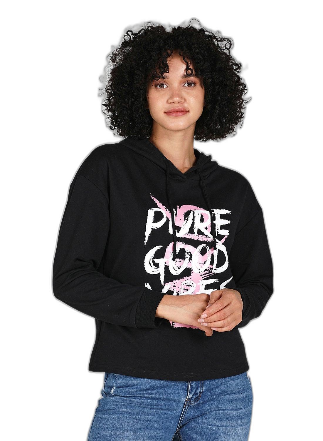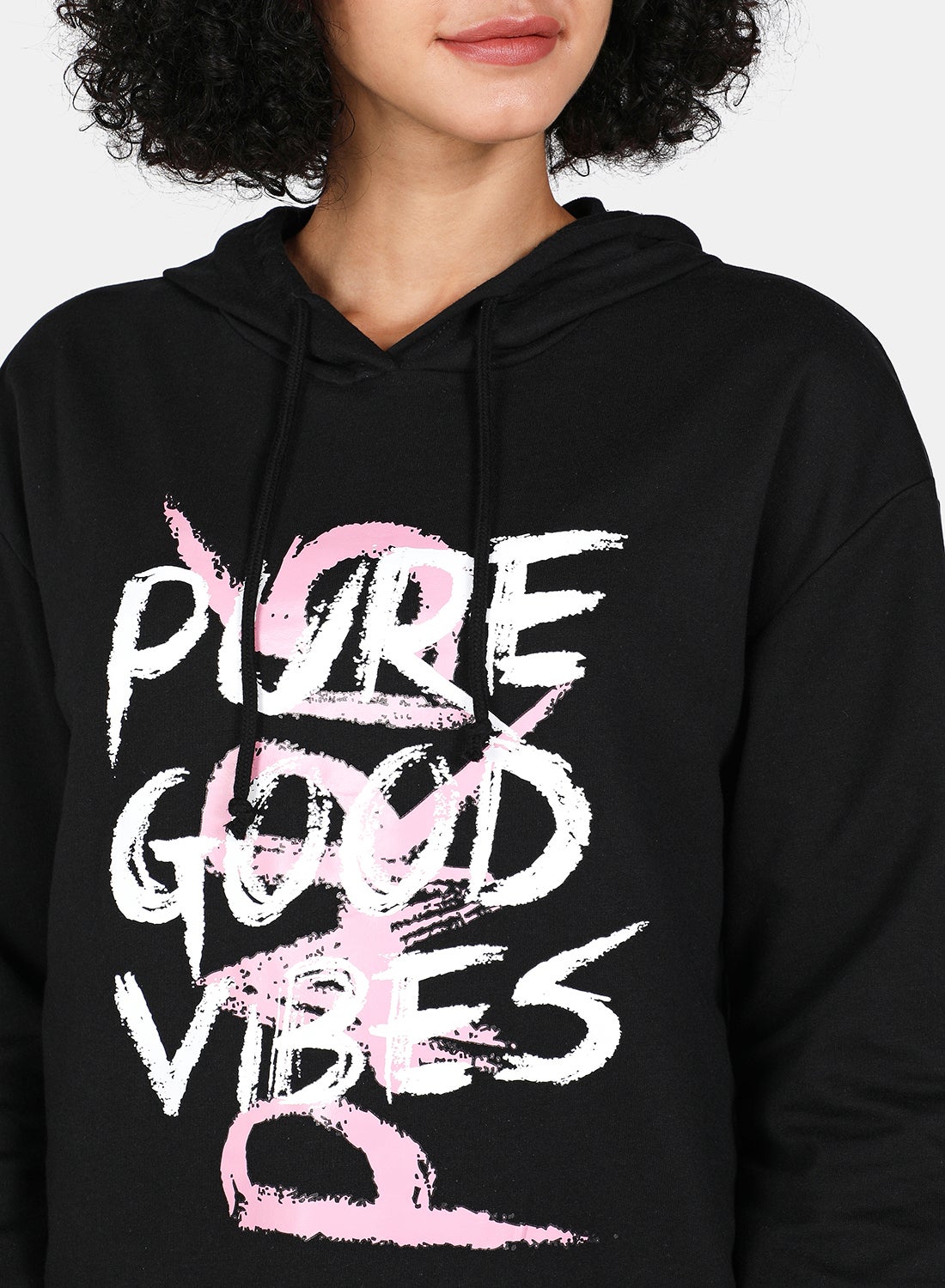 Pure Good Vibes Slogan Printed Long Sleeves Drawstring Detail Hoodie Black