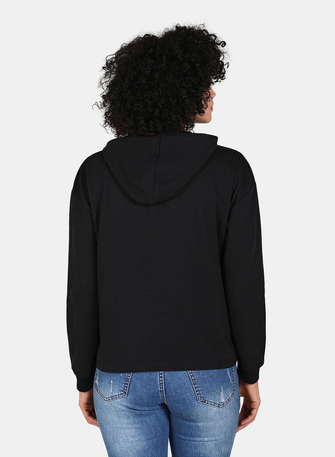 Black Hoodie with Drawstring and Printed Slogan “Pure Good Vibes” on Long Sleeves.
