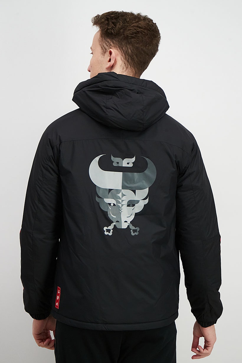This product is easy to care for as it is machine washable. It has a sportswear fit and is available in Asian sizing. The jacket has a medium thickness and is suitable for training. It is made of 100% polyester fabric and features a brand logo pattern and print. This jacket is classified as sportswear and comes in a black color family.