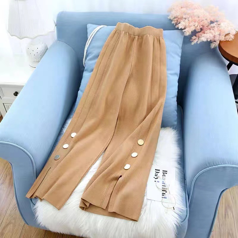Black knitted wide-leg pants women’s autumn and winter high waist split casual straight lazy wind draping mop pants